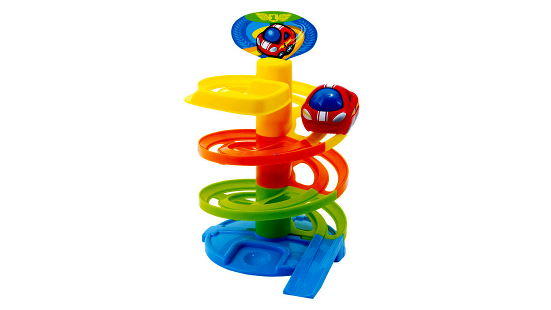 Az autó speciálisan kialakított mérete révén tökéletesen illeszkedik a kis kezekbe. A torony tetejéről indítva az autó egyre gyorsabban gurul lefelé a spirálpályán, ami izgalmas kihívást jelent és segíti a kéz- és szemkoordináció fejlődését. Egy egyszerű, de annál hatékonyabb játék a finommotoros képességek fejlesztésére.