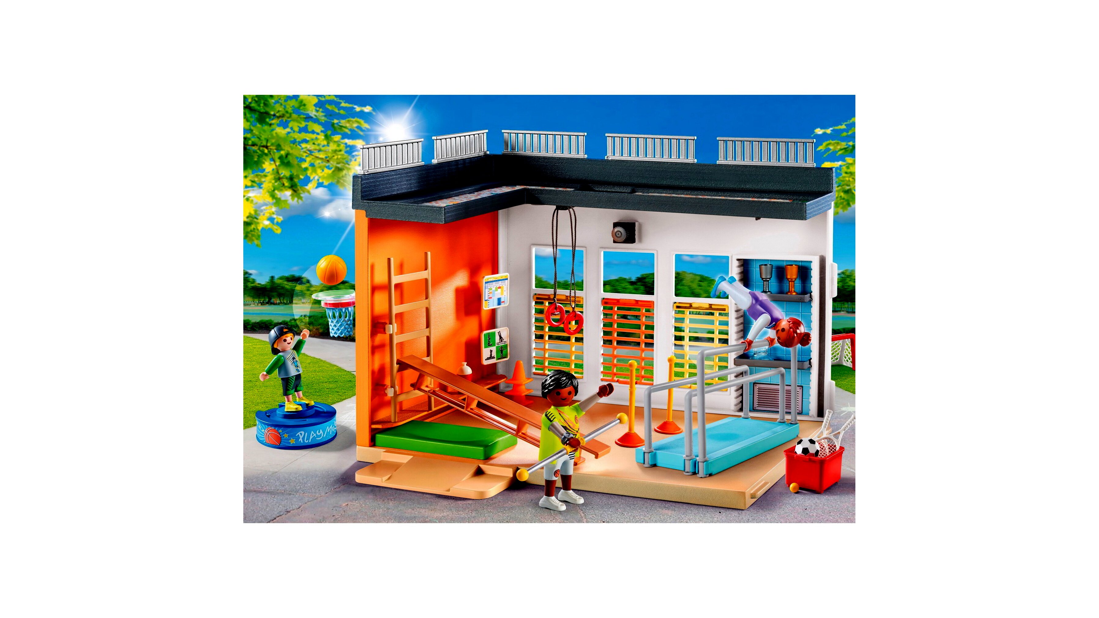 Ma a testnevelés szerepel a PLAYMOBIL City menetrendjében - irány az edzőterem! Itt mindent megtalál, amire szüksége van a testneveléshez: különféle felszerelések, például párhuzamos rúd, létra, pad, gyűrűk, szőnyeg és egyéb kiegészítők.