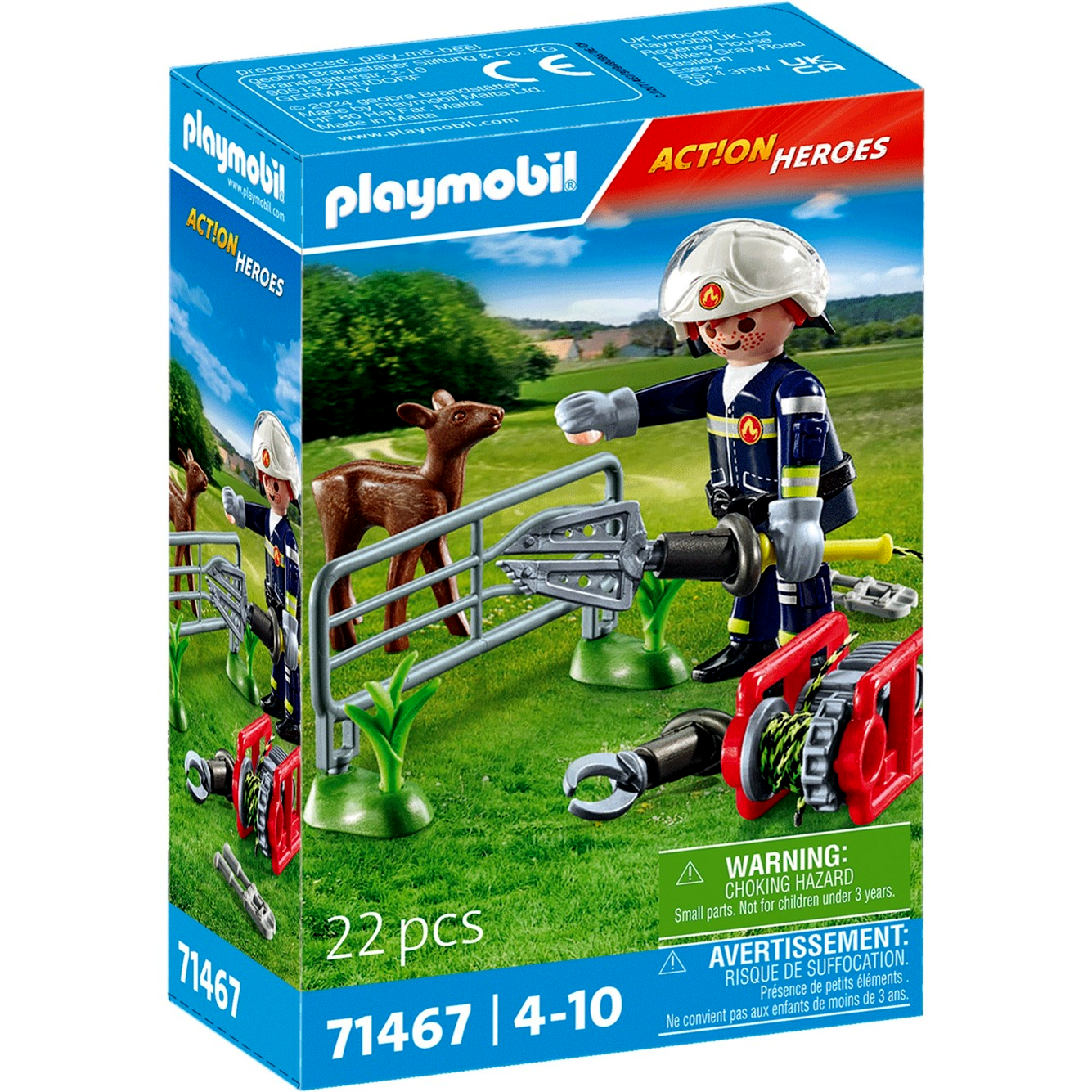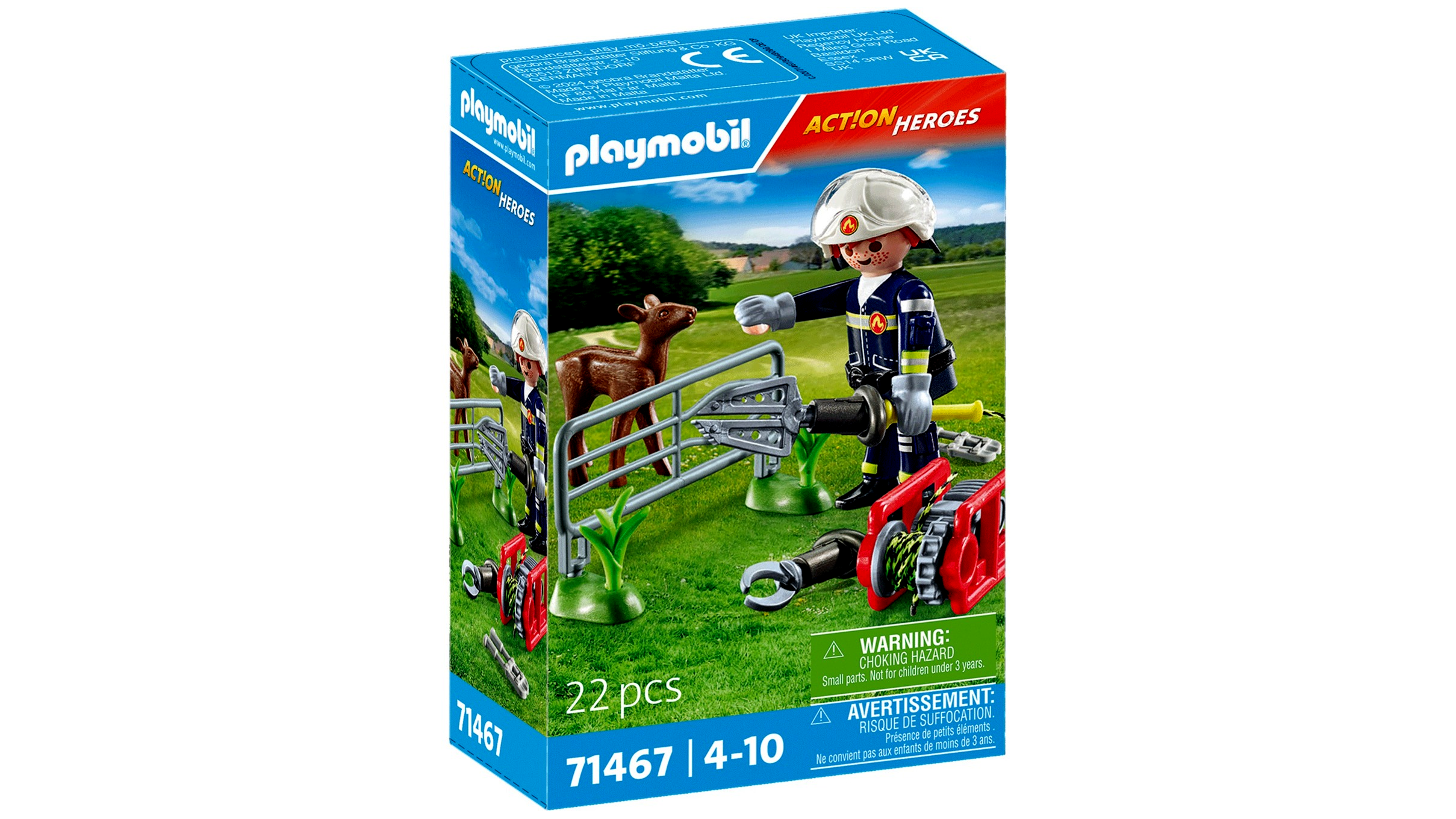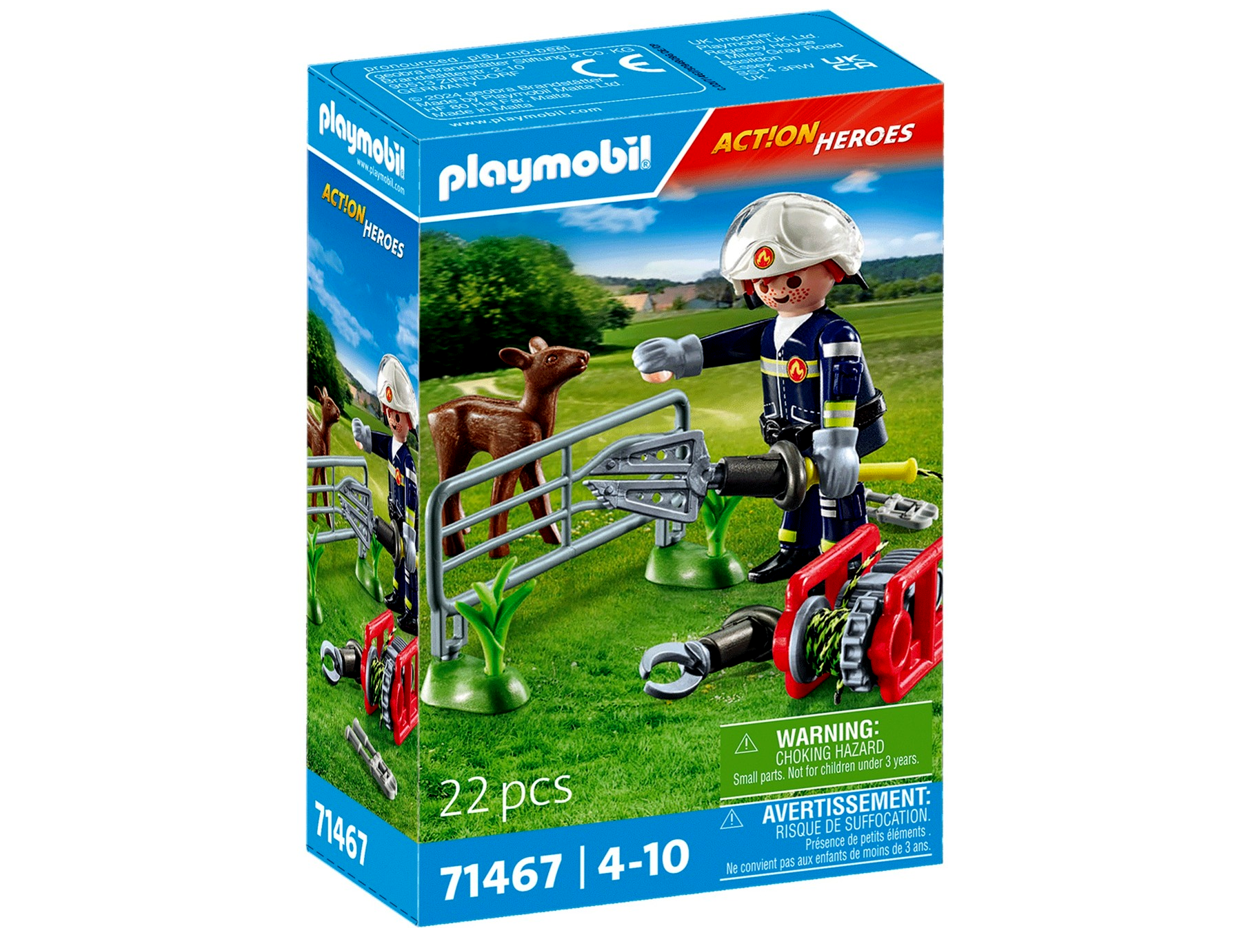A tűzoltó figura számos különleges kellékkel van felszerelve, hogy a mentés a lehető legsimábban menjen. Speciális szerszámaival, mint a mentőolló és a szórófej, ügyesen tudja szétfeszíteni a kerítést, hogy kiszabadítsa az őzet. A figura kivehető kesztyűcsatlakozókkal és mozgatható napellenzővel ellátott sisakkal rendelkezik, így még biztonságosabbá válik a mentés.