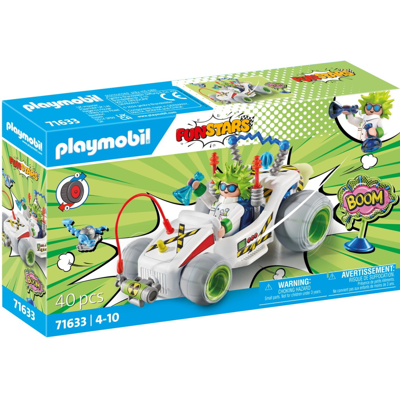 - Tartalom/Kiegészítők: 1 figura, 1 gokart őrült kiegészítőkkel, 1 tábla, 2 laborüvegek