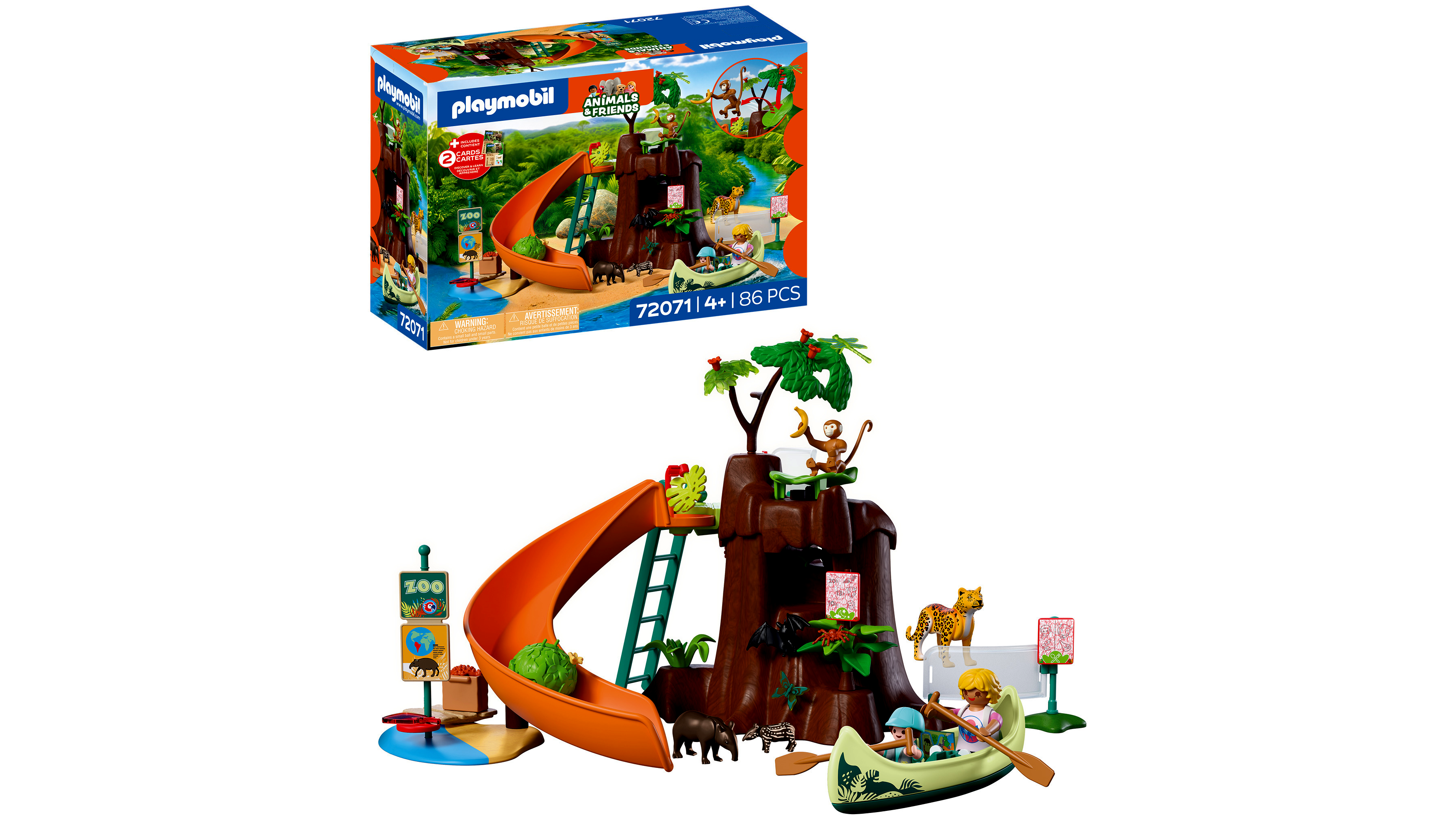 Speciális elemek és kiegészítők: 1 felfedező üveg, 3 állatos adatlap, 1 mozgáslap, 2 mozgáskártya, 1 kenu, 2 evező, 1 rönk, 1 villás ág, 5 virág, 2 csillagvirág, 2 lombozat, 4 növény, 1 ágkoszorú, 1 levélgombóc, 2 inda, 1 bogyófürt, 1 alma, 1 banán, 1 húsos csont, 1 korong, 1 táblatartó, 1 zászlórúd, 3 alaplap, 1 létra, 1 rönkcsúszda, 1 fatönk, 1 csúzli, 1 térkép, 1 digitális fényképezőgép, 1 hátizsák, 1 baseball sapka, 1 címkeív