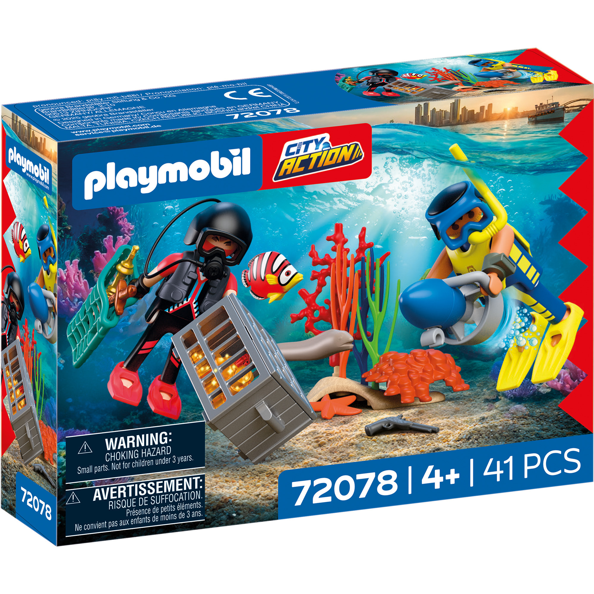 A készlet különlegessége, hogy ötvözi a rendőrségi akciót a kincsvadász kalandokkal: a gyerekek eljátszhatják, ahogy a búvár rendőr felkutatja az ellopott kincset, biztonságba helyezi a hálókosárba vagy ládába, majd víz alatti robogóján elindul vele a felszín felé. A muréna, a színes halak és a korallok segítségével egy egész víz alatti világ építhető fel, amelyben a történeteknek csak a képzelet szab határt. A részletesen kidolgozott kiegészítők – mint a mini számítógép, búvárfelszerelések, fegyverek és kincsek – valósághű, mégis játékos élményt biztosítanak.