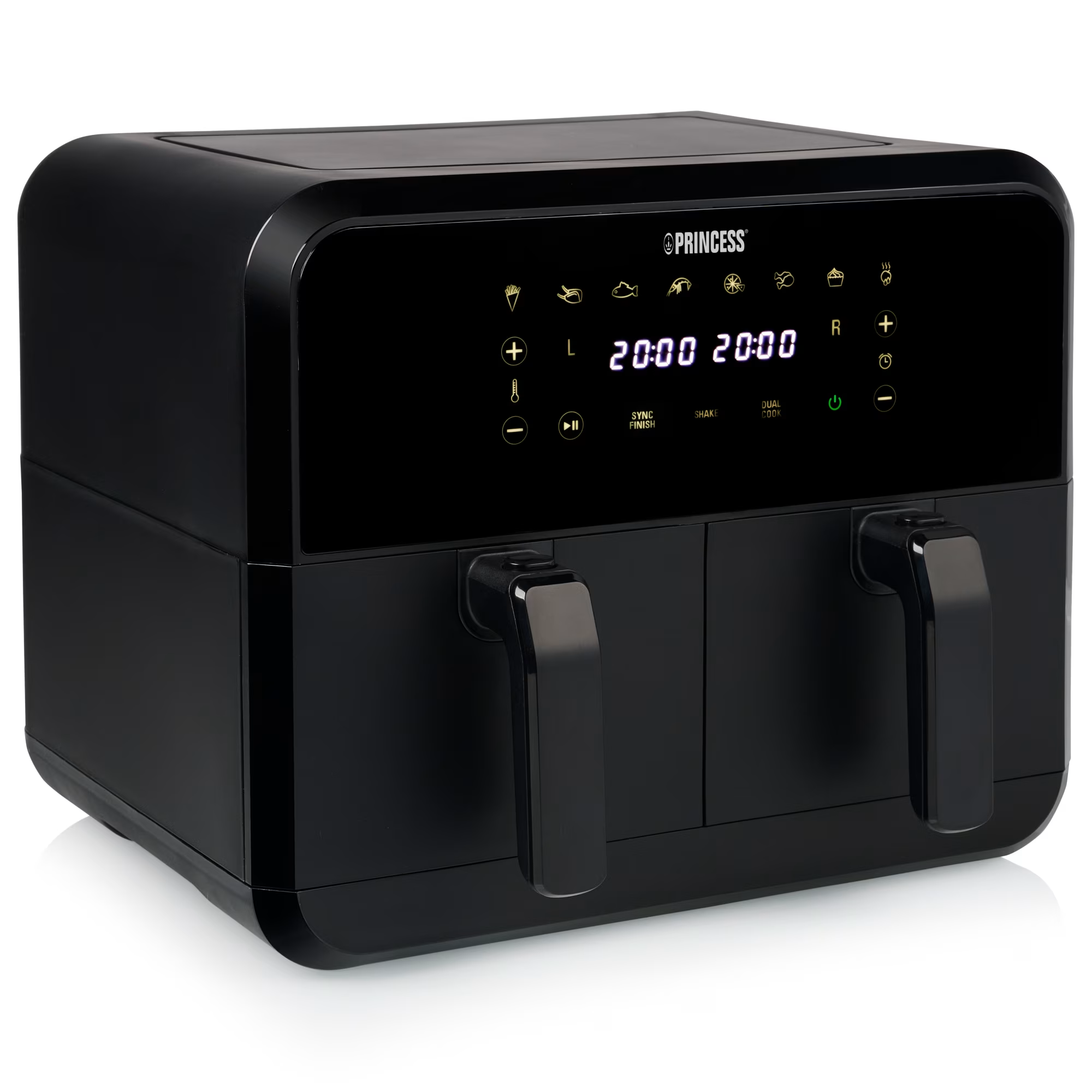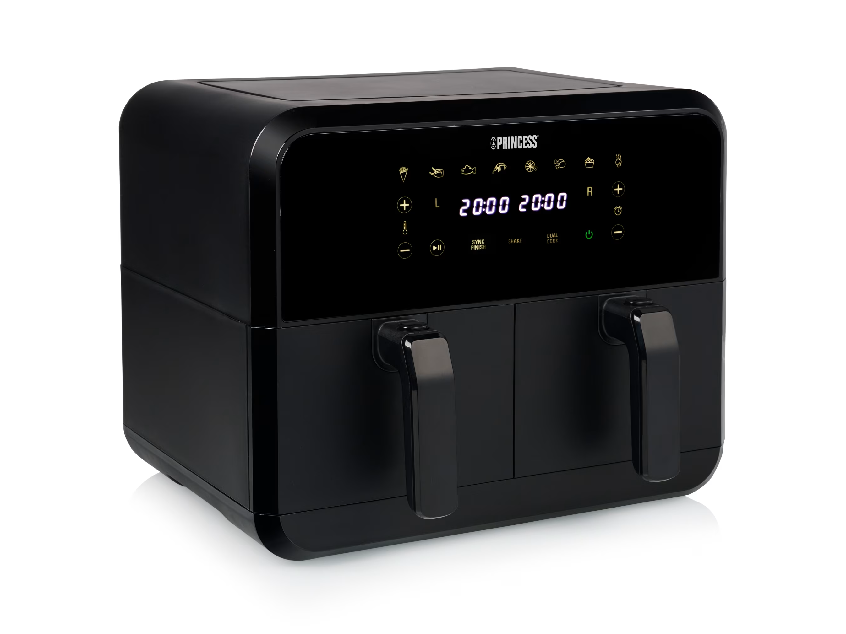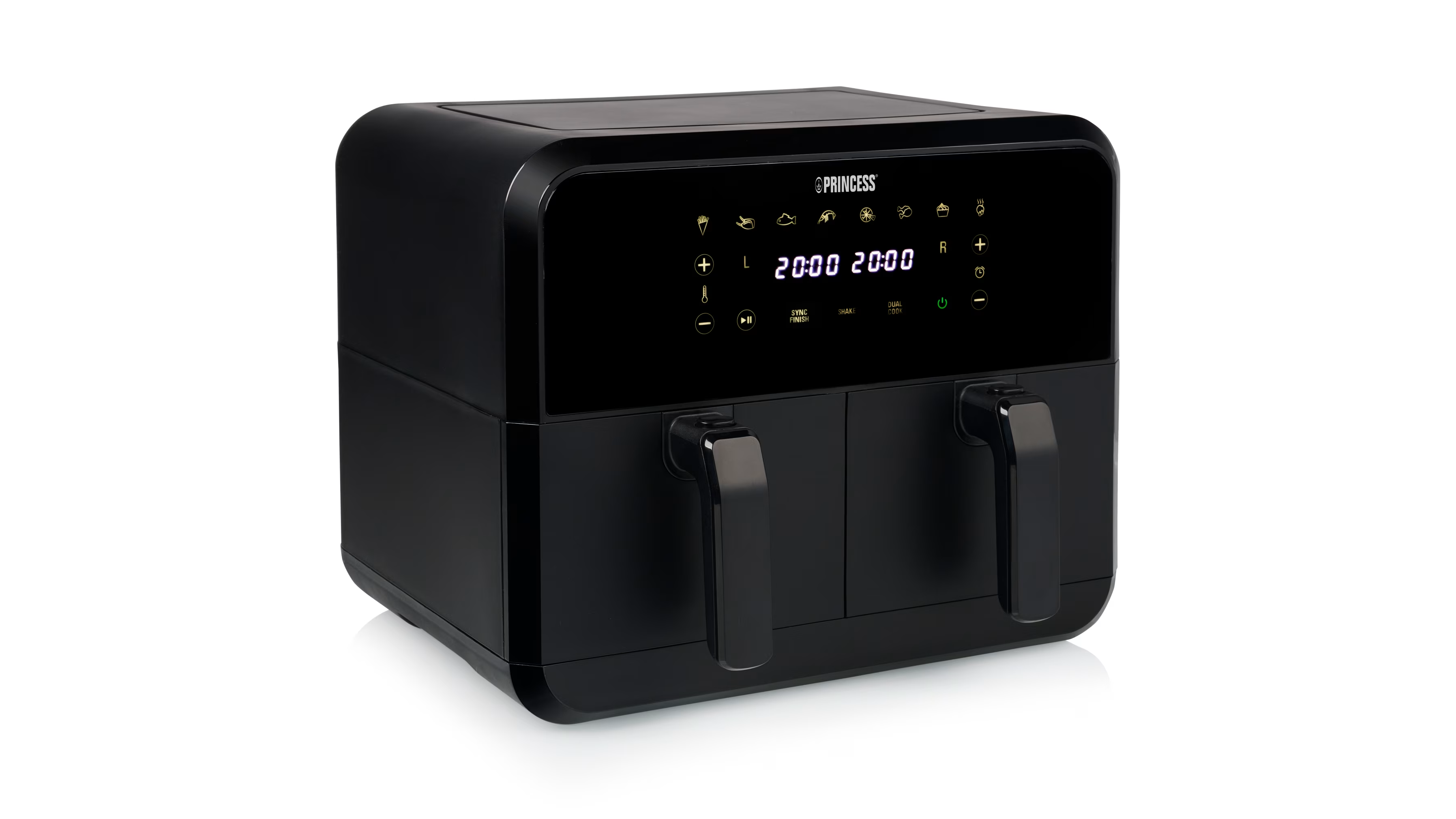 Ez a légsütő 8 literes kapacitással rendelkezik, 2 kosárra osztva, mindegyikben 4 liter fér el. A légsütő extra gyorsan felmelegszik, és 2400 wattos.