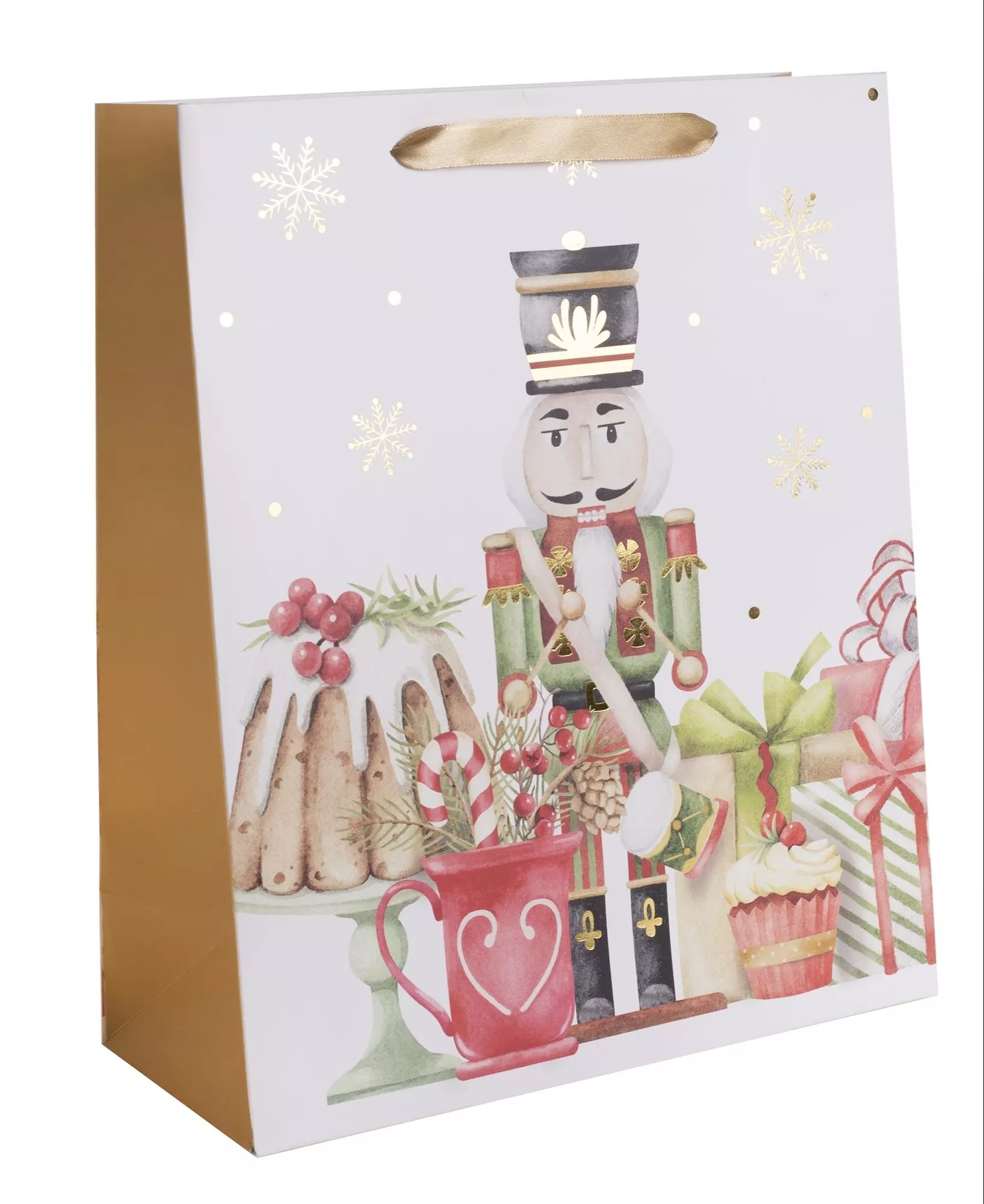Ez az exkluzív ajándéktasak a Diótörő mintával tökéletes választás ünnepi alkalmakra, születésnapokra vagy különleges eseményekre. Elegáns arany színével és klasszikus mintájával minden ajándékot különlegessé és varázslatossá tesz.
