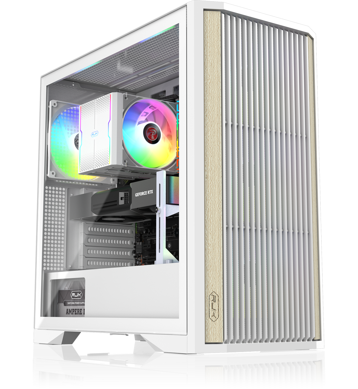 Az edzett üveg oldallapok megjelenésével a PC egyre inkább látványelem lett: a gondosan megválasztott ARGB világítás, a fehér belső tér és az egyedi faerezetes borítás harmonikus, egyedi megjelenést ad. A címezhető RGB rendszernek köszönhetően külön színt kaphatnak a ventilátorok, a vízhűtés, a memória vagy akár a GPU, így a gép külseje könnyen összehangolható a szoba vagy a gamer sarok színvilágával.