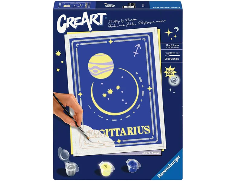 CreArt - ez a Ravensburger számok alapján történő színezés fiataloknak és felnőtteknek. Minden készlet tartalmaz mindent, ami a színezéshez szükséges. Nincs szükség a színek keverésére. A motívumvonalak fel vannak nyomtatva, és egyszerűen ki lehet őket színezni az akrilfestékekkel. Ez gyors sikerélményt tesz lehetővé, és dekoratív fali dekorációt hoz létre. Különböző méretű motívumokból is nagy választék áll rendelkezésre. Ez a készlet egy spirituális asztrológiai motívumot készít a Kos csillagjegyről 18 x 24 centiméteres méretben. Különleges extraként ezüst festéket és fluoreszkáló festéket is tartalmaz, így a motívum a sötétben is világít.