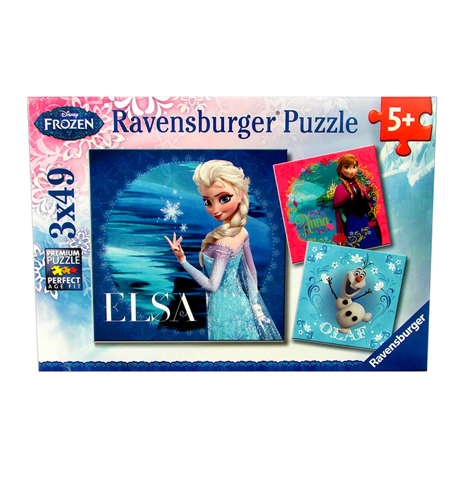 A kedves Disney mese, a Jégvarázs szereplőit, Elsa hercegnőt, Anna hercegnőt és Olafot a hóembert ábrázoló 3 x 49 db-os puzzle. A Jégvarázs 3 x 49 db-os puzzle kiváló minőségű, tökéletes illeszkedő mozaikdarabokkal készült.