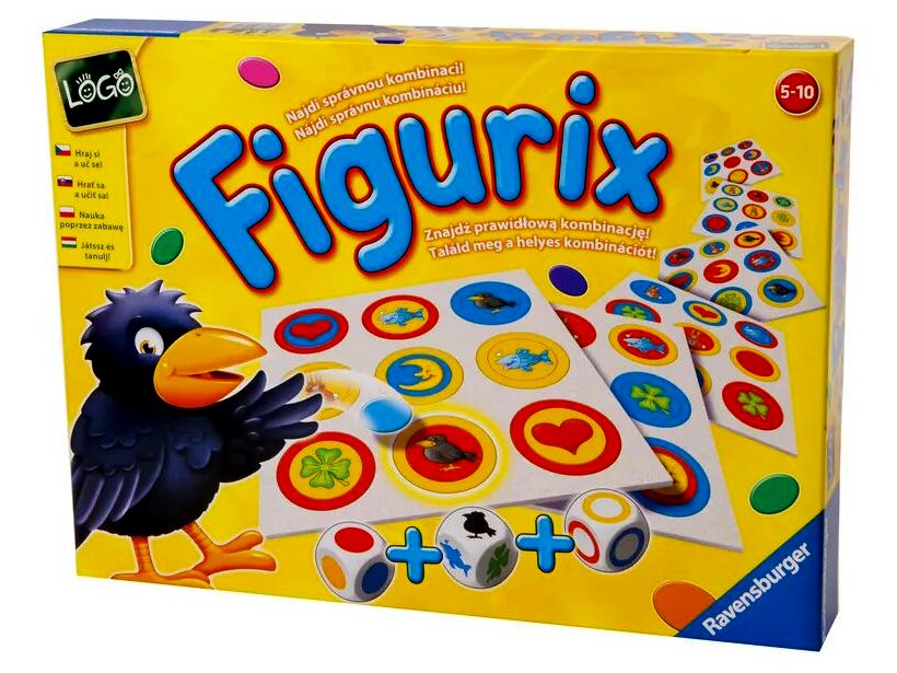 Ez a pörgős, mégis könnyen tanulható logikai játék azonnal játékra csábít. A három különböző dobókockán színes körök, gyűrűk és egyéb alakzatok jelennek meg, a gyerekek feladata pedig, hogy elsőként találják meg a táblán azt a mezőt, amely pontosan megfelel a kidobott kombinációnak. Aki a leggyorsabban reagál, és ügyesen helyezi el korongjait, az kerül győztesen ki a fordulókból.