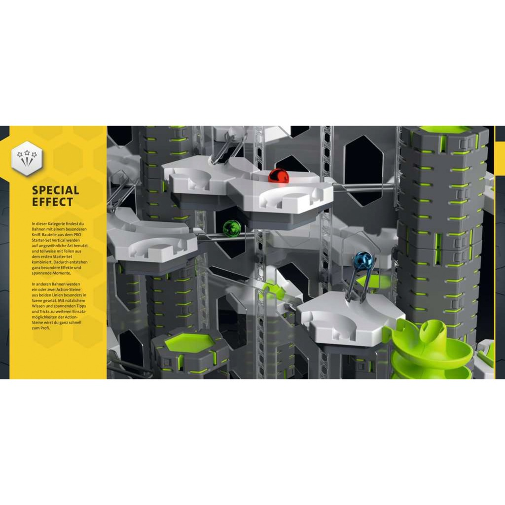 A könyv bemutatja, hogyan kombinálhatod a GraviTrax CORE kezdőkészletet a PRO Vertical kezdőkészlettel és további 8 bővítőkészlettel, például hidakkal, turntable-vel vagy helix-szel. Minden pálya rendelkezik egyedi tulajdonságokkal, amelyeket beépíthetsz saját pályádba, és új magasságokba emelheted azokat.