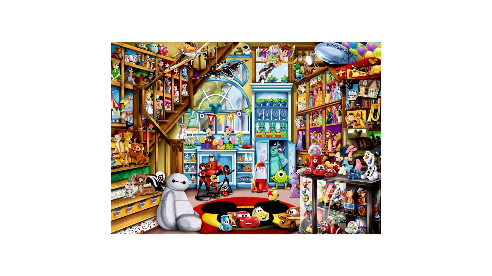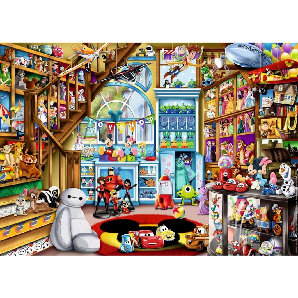 Ez a kirakós játék egy játékboltot ábrázol, amely tele van népszerű Disney szereplőkkel.