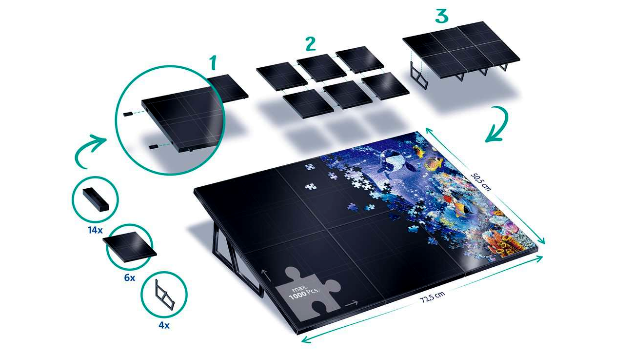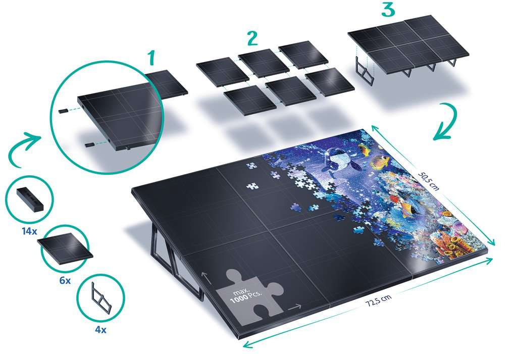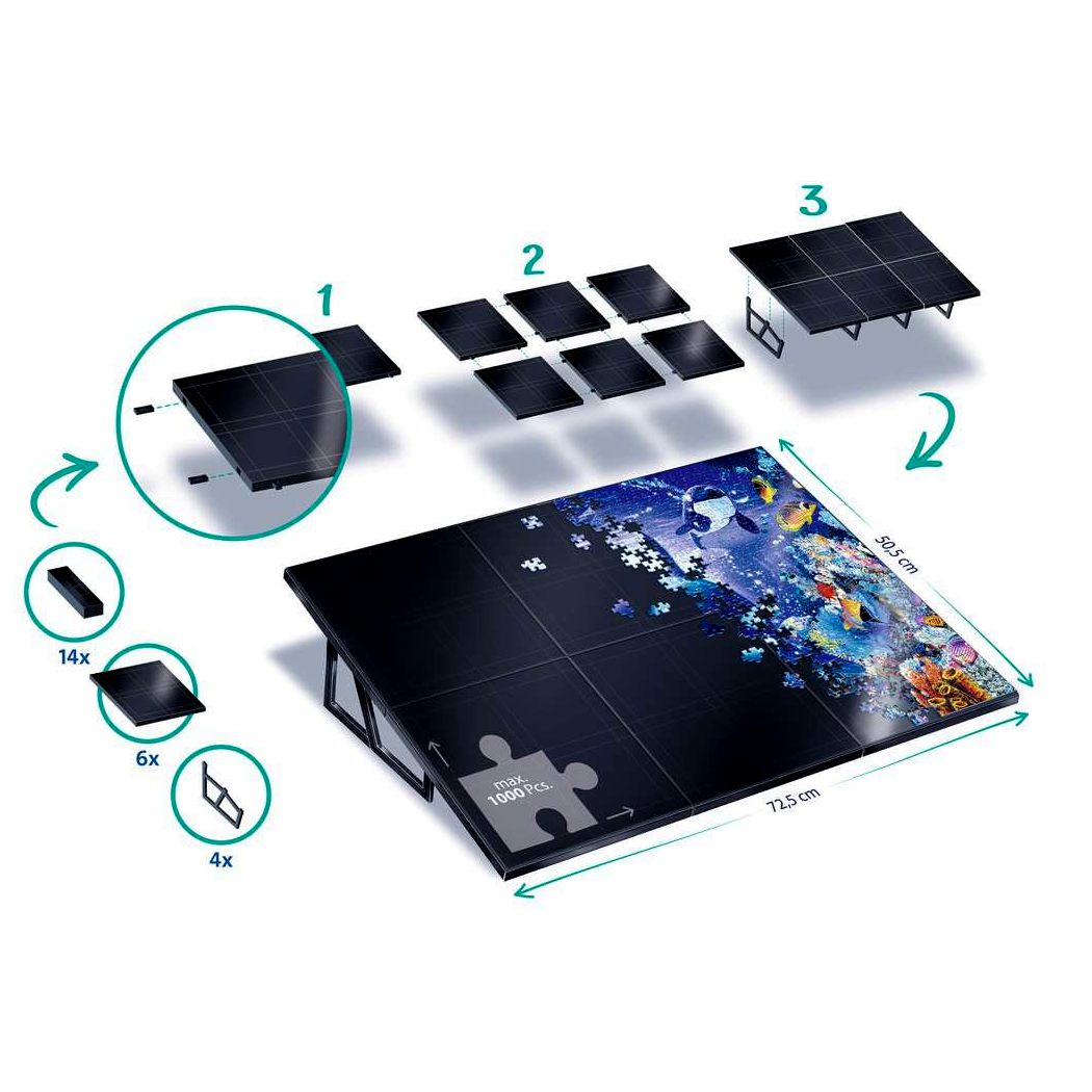 Az állvány egyedülálló kialakítása lehetővé teszi, hogy minden puzzle darab biztosan a helyén maradjon a csúszásmentes felületnek köszönhetően. Az ízléses fekete felület 98%-ban újrahasznosított anyagból készült, ami környezetbarát választás is egyben. A 24 összekapcsolható részből álló állvány stabil és könnyű egyszerre, így könnyedén hordozhatja bárhová.