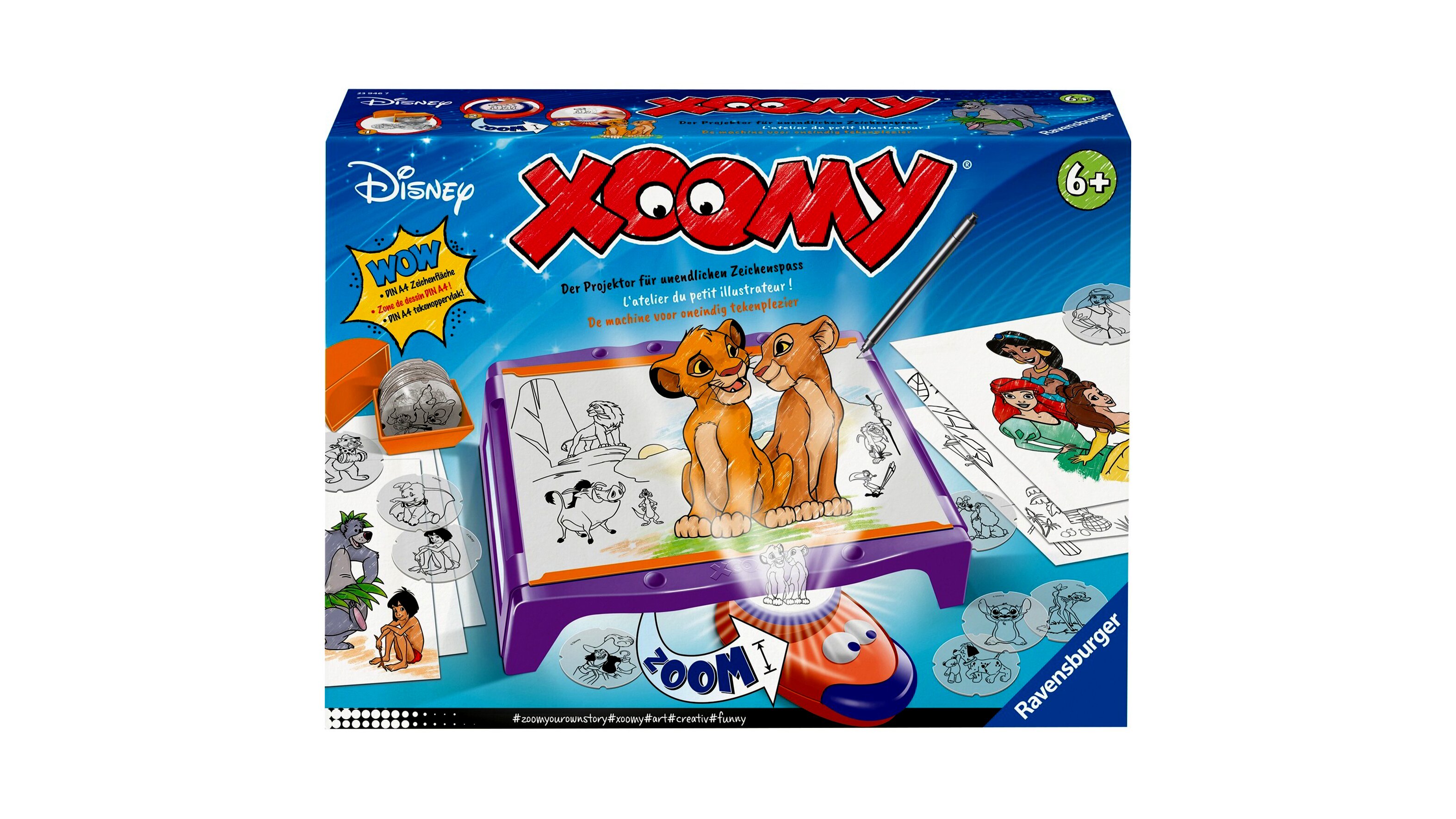 A Ravensburger Xoomy Maxi a legnépszerűbb Disney karaktereket és hercegnőket kínálja sablonként, így megalkothatod saját történeteidet és elképesztő világokat. Az A4-es méretű asztalhoz bármilyen szabványos DIN A4 rajzpapírt használhatsz, így a lehetőségek végtelenek.