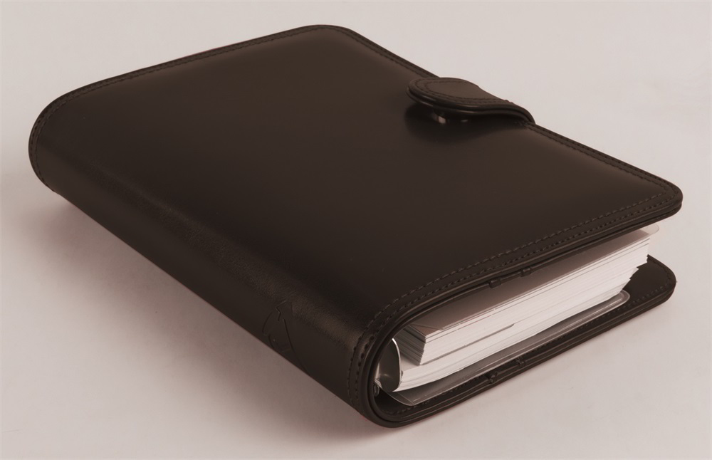 Műbőr, elöl bankkártya- és névjegytartóval, hátul jegyzet- és tolltartóval. A gyűrűs kalendárium tartalma: éves heti beosztású naptárbetét, négyzethálós jegyzetlap, telefonregiszter, kártyatartó, vonalzó és elválasztólap.