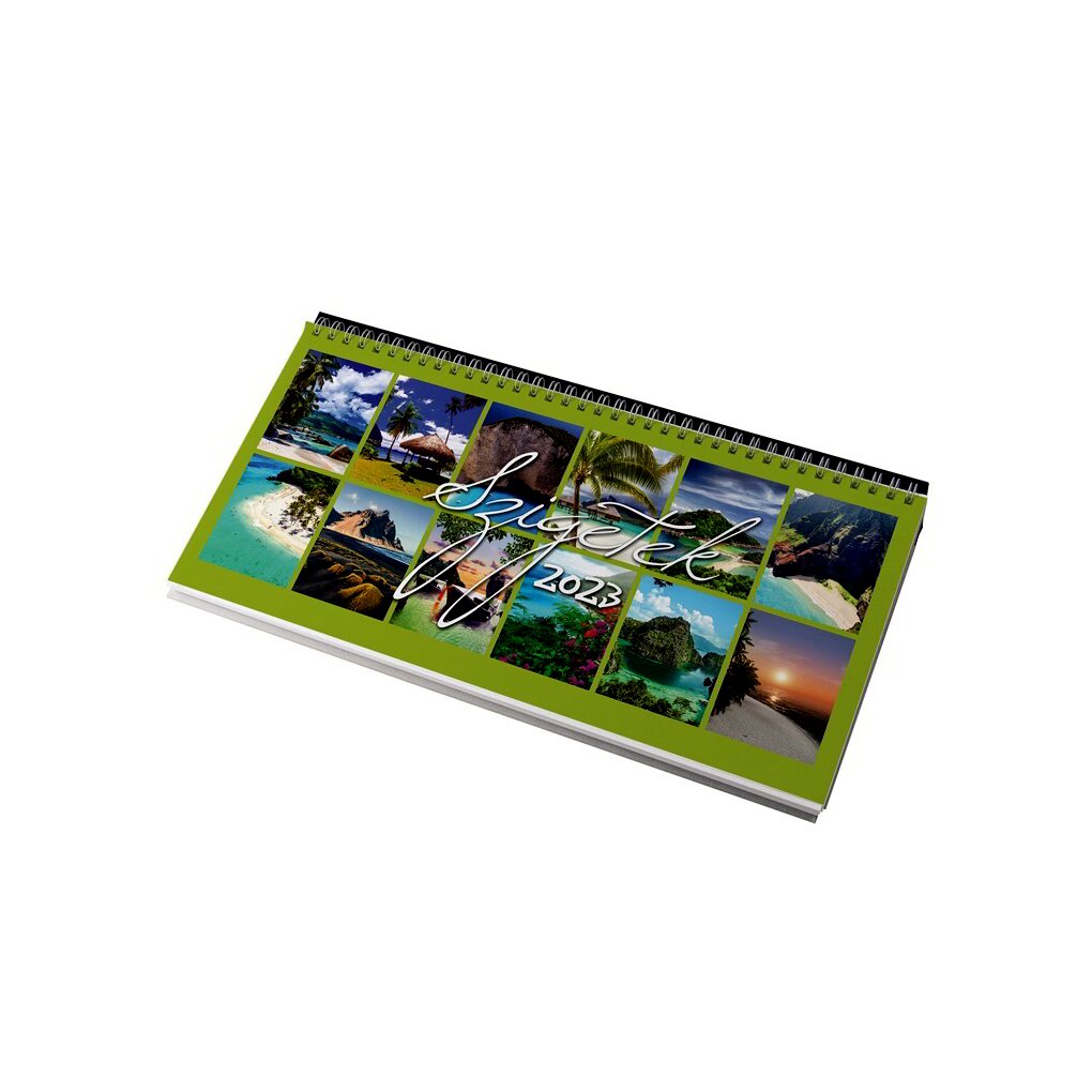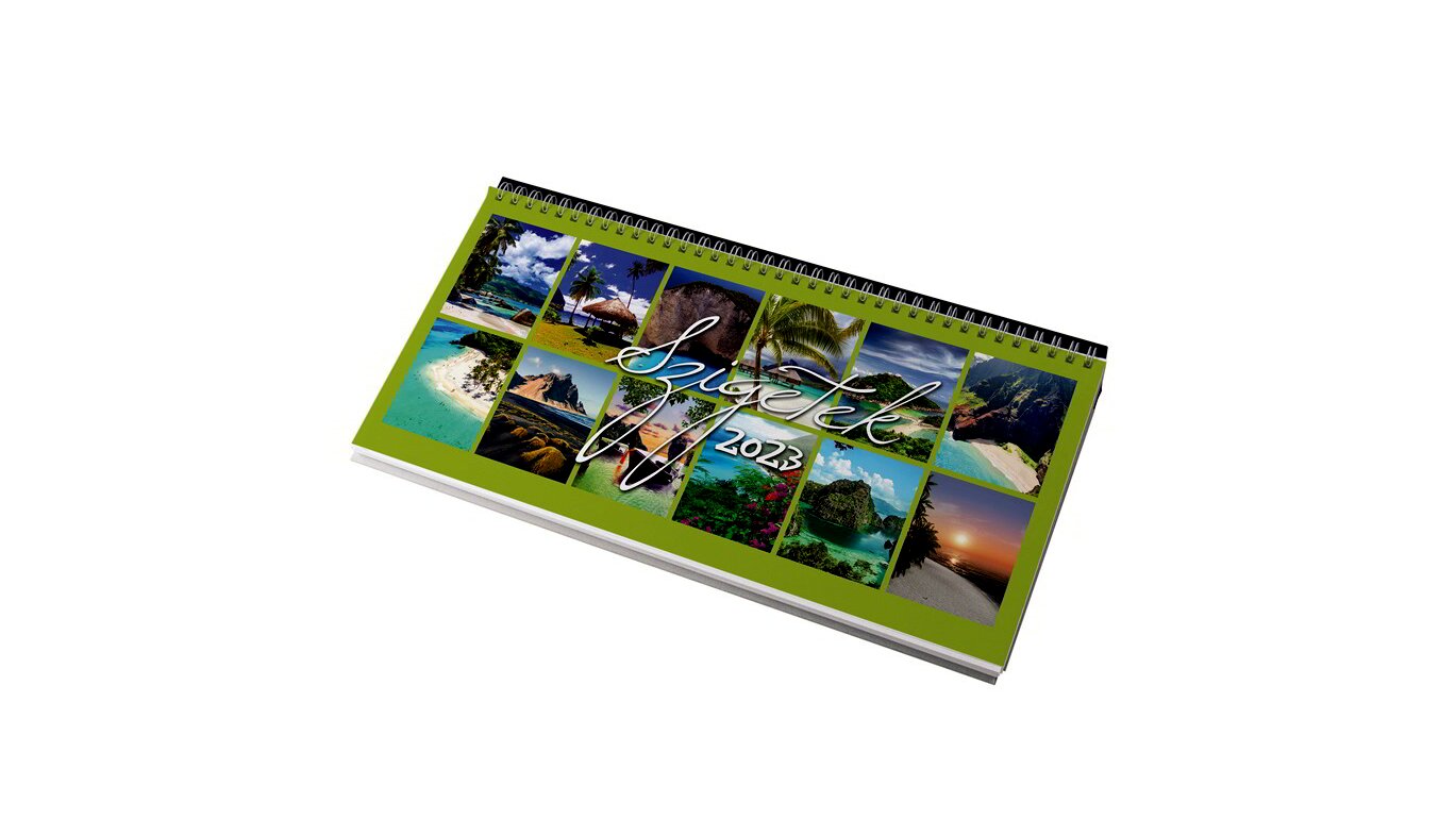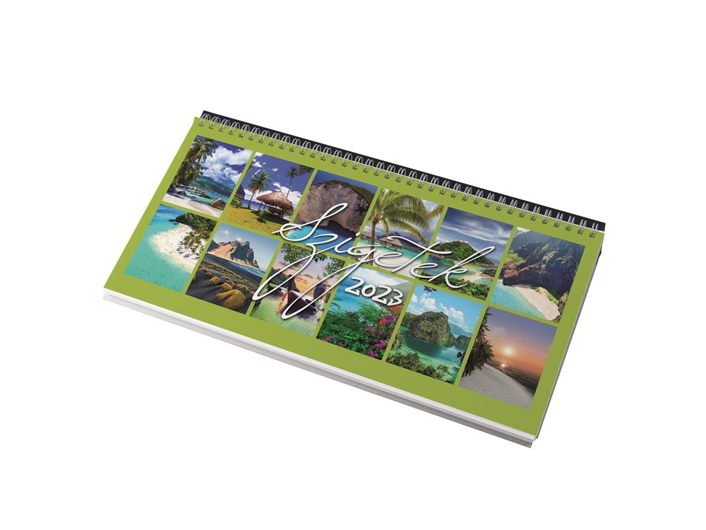 Ikerspirállal összefűzött naptárak heti beosztással, 12 színes képpel, színes műbőrrel borított fekvő tartóval. Egyediesítés: présfólia, vakdombor, szita.