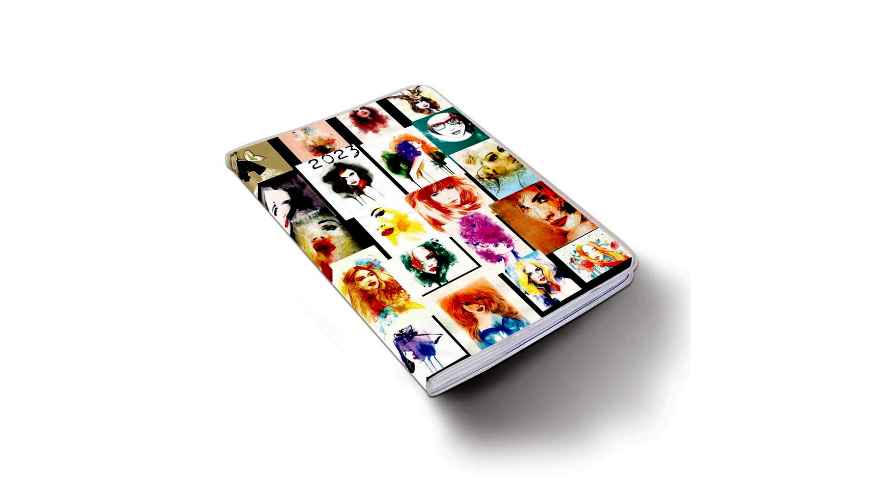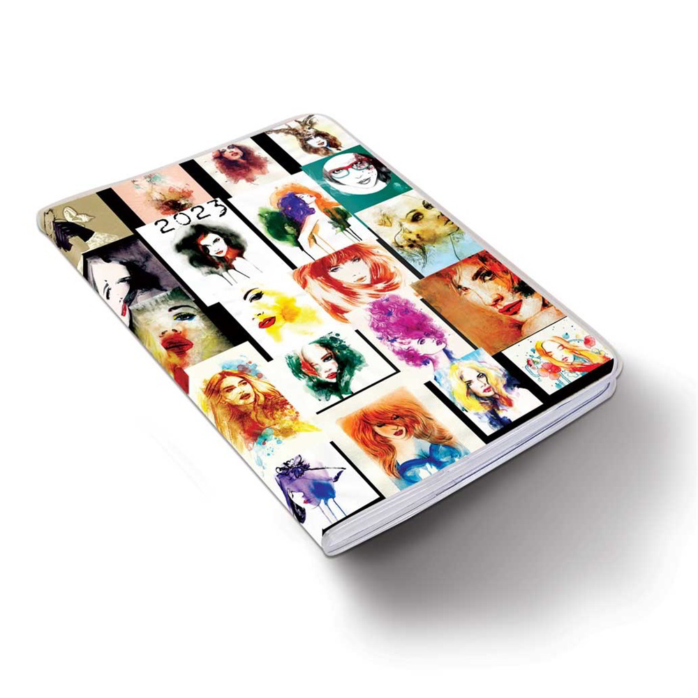Átlátszó műanyag tokba helyezett agenda, golyóstolltartóval és névjegytartóval.