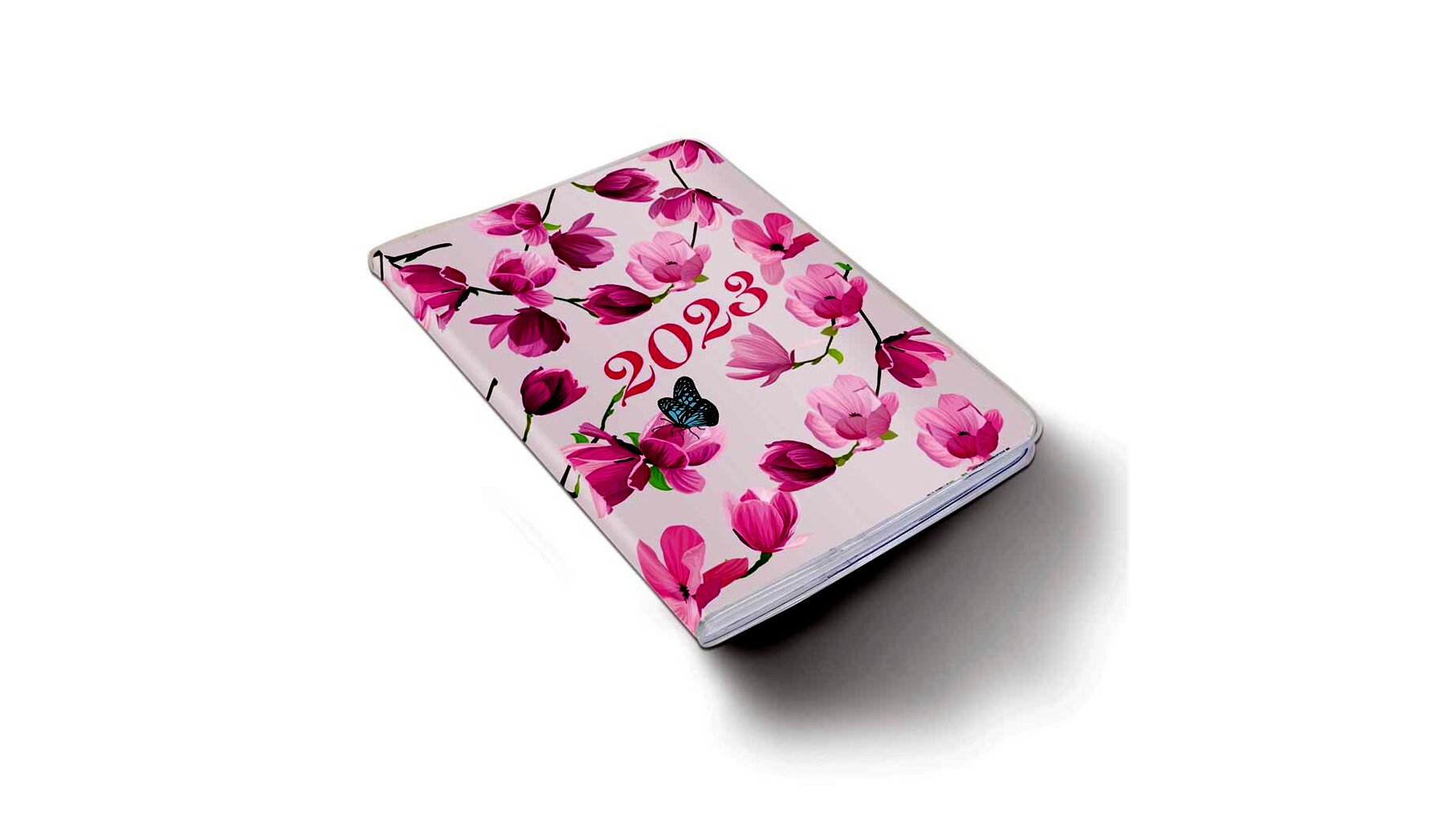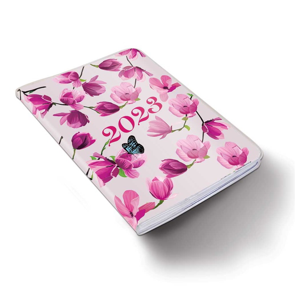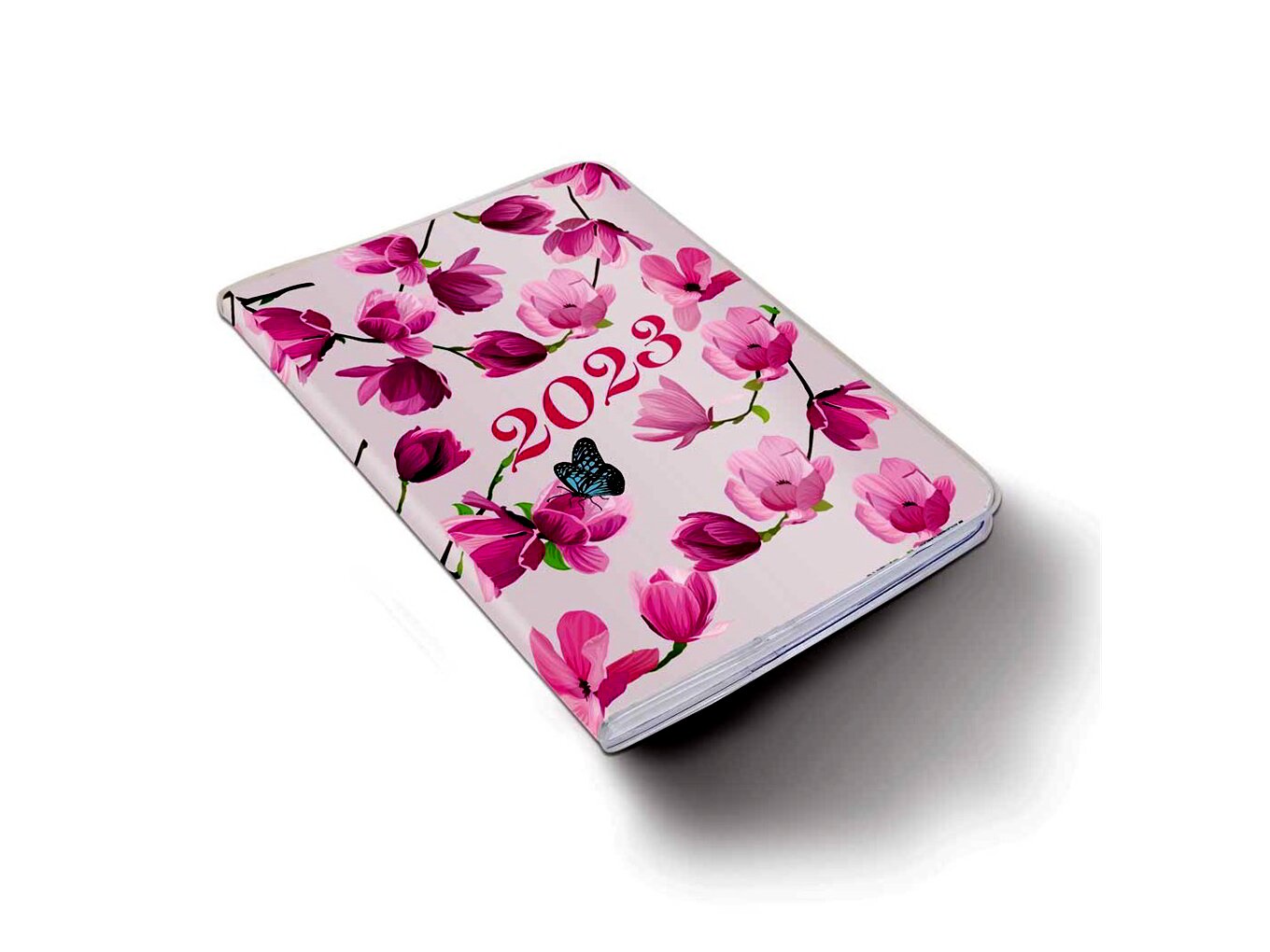 Átlátszó műanyag tokba helyezett agenda, golyóstolltartóval és névjegytartóval.