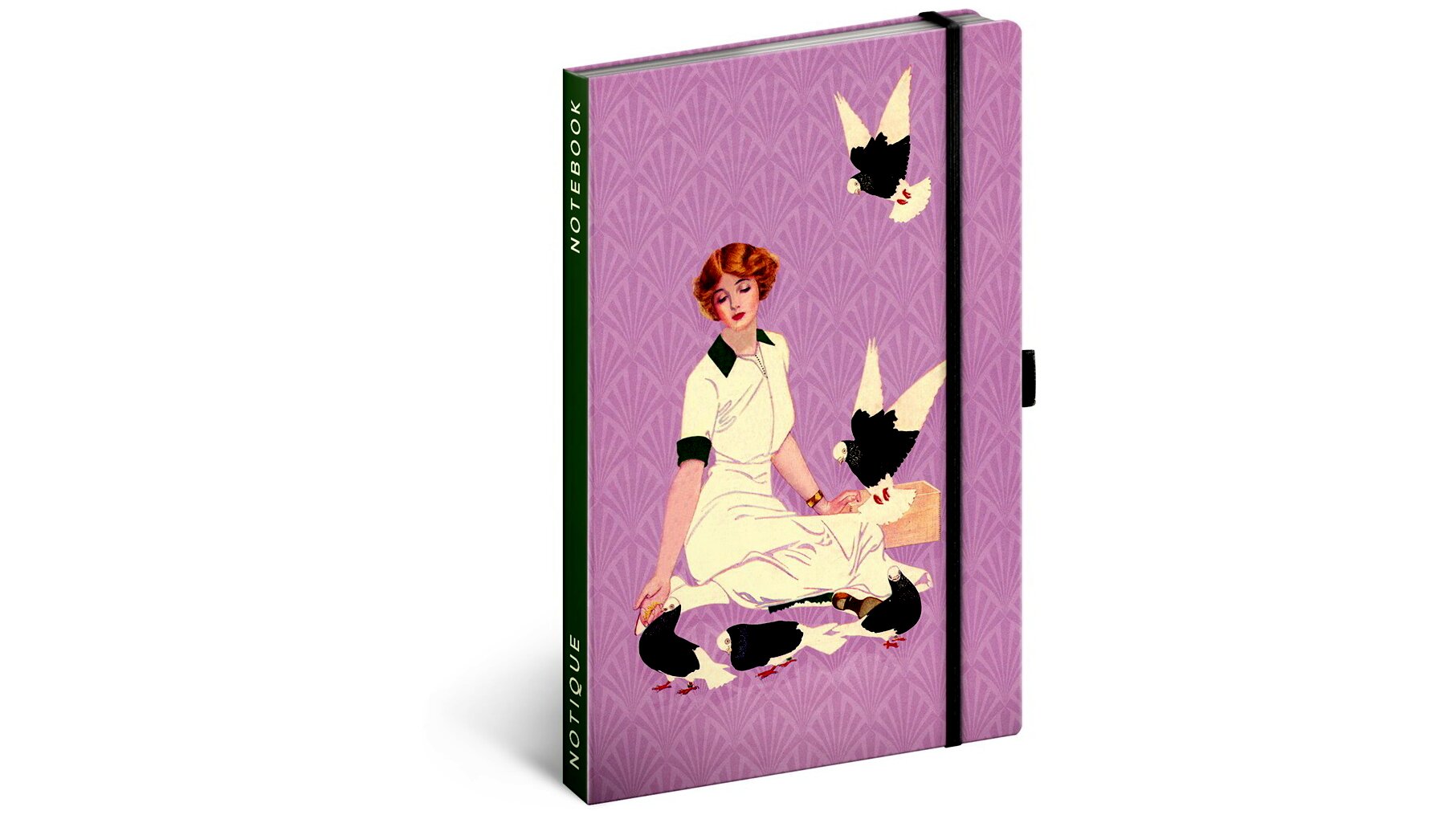 Keménytáblás notesz leszorító gumiszalaggal, egy belső zsebet tartalmaz. 172 krémszínű, vonalas oldal.