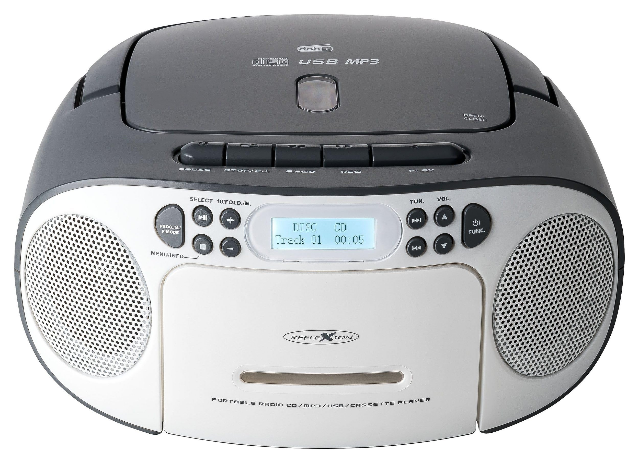 A Reflexioin RCR22600DAB hordozható boombox DAB+ rádiót, kazettát és CD-lejátszást kombinál. Az MP3 zene USB-n vagy Aux bemeneten keresztül is lejátszható.