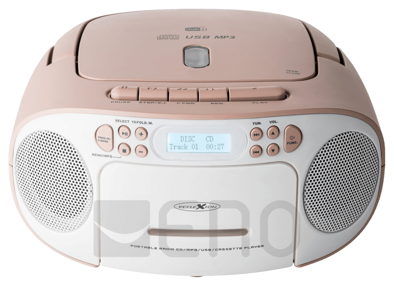 Egy hordozható boombox RCR22600DAB egy reflexiós kombinációs DAB+ rádió, kazettával és CD-vel. Az MP3 zene USB homályos aux bemeneten keresztül is lejátszható.