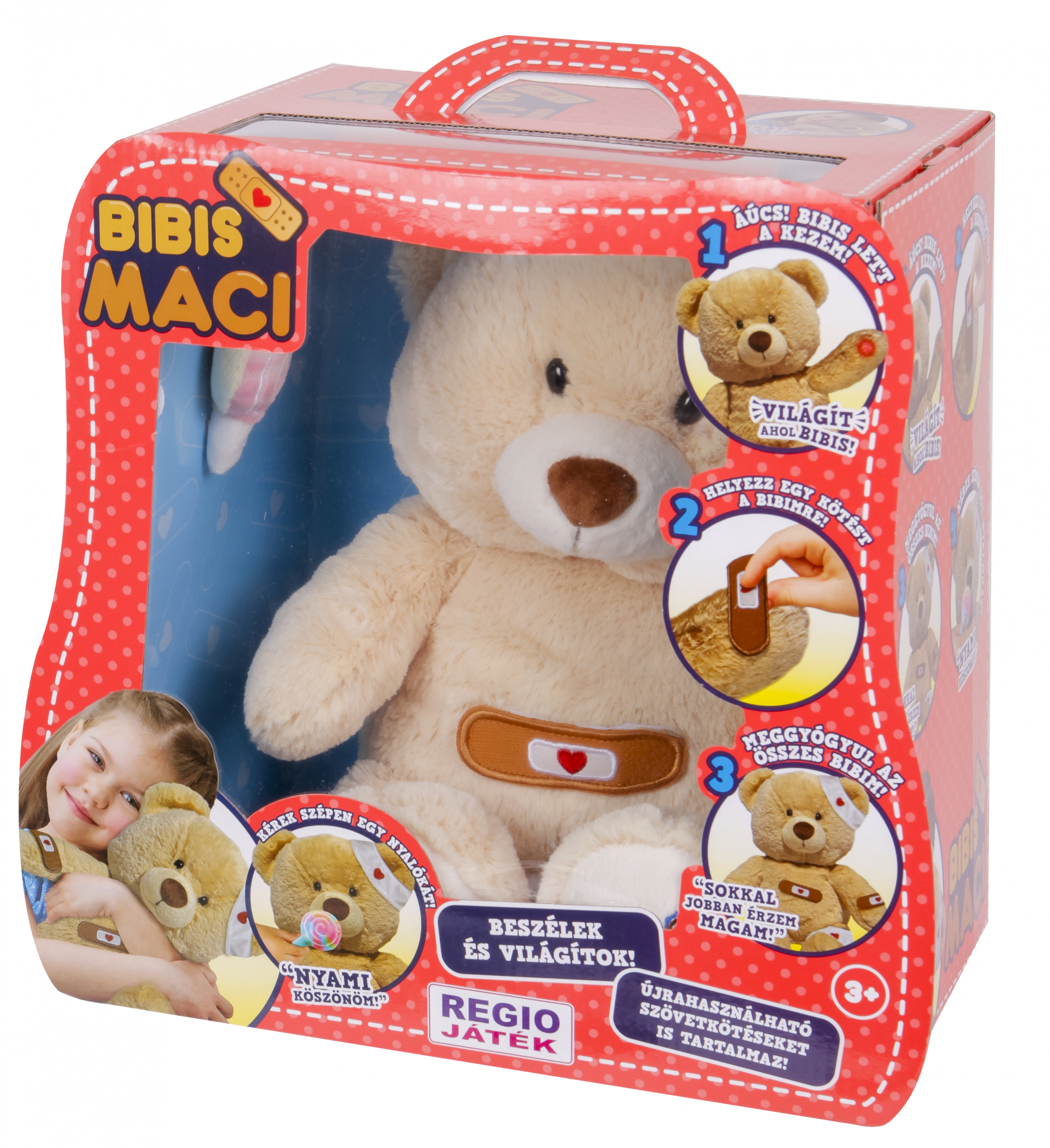 Fáj a lába, a pocakja, a karja... Meggyógyítjátok őt? Teddy elmondja, hogy hol fáj neki, és az adott terület vörösen izzik is. A gyerekeknek a "fájó pontokra" kell ráhelyezniük a mágneses kötszereket, hogy a maci helyrejöjjön. Összesen 5 darab érzékelős pont található a mackó testén.
