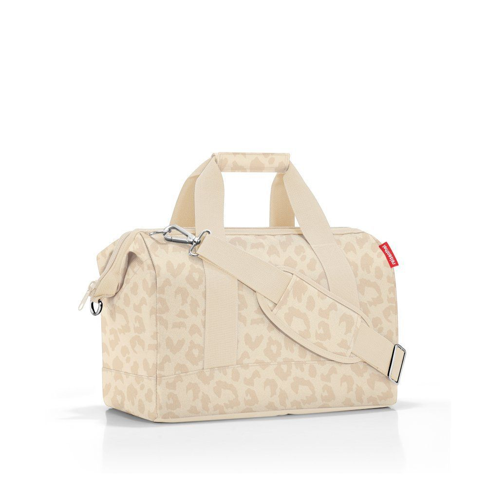 A Reisenthel ikonikus M méretű allrounder táskája a mindennapi bevásárlástól a hétvégi kiruccanásokig minden helyzetben megállja a helyét. Modern, bézs alapon leopárd mintás dizájnja egyesíti a divatos megjelenést a kiváló funkcionalitással, így egyszerre lehet bevásárlótáska, sporttáska vagy kézipoggyász.