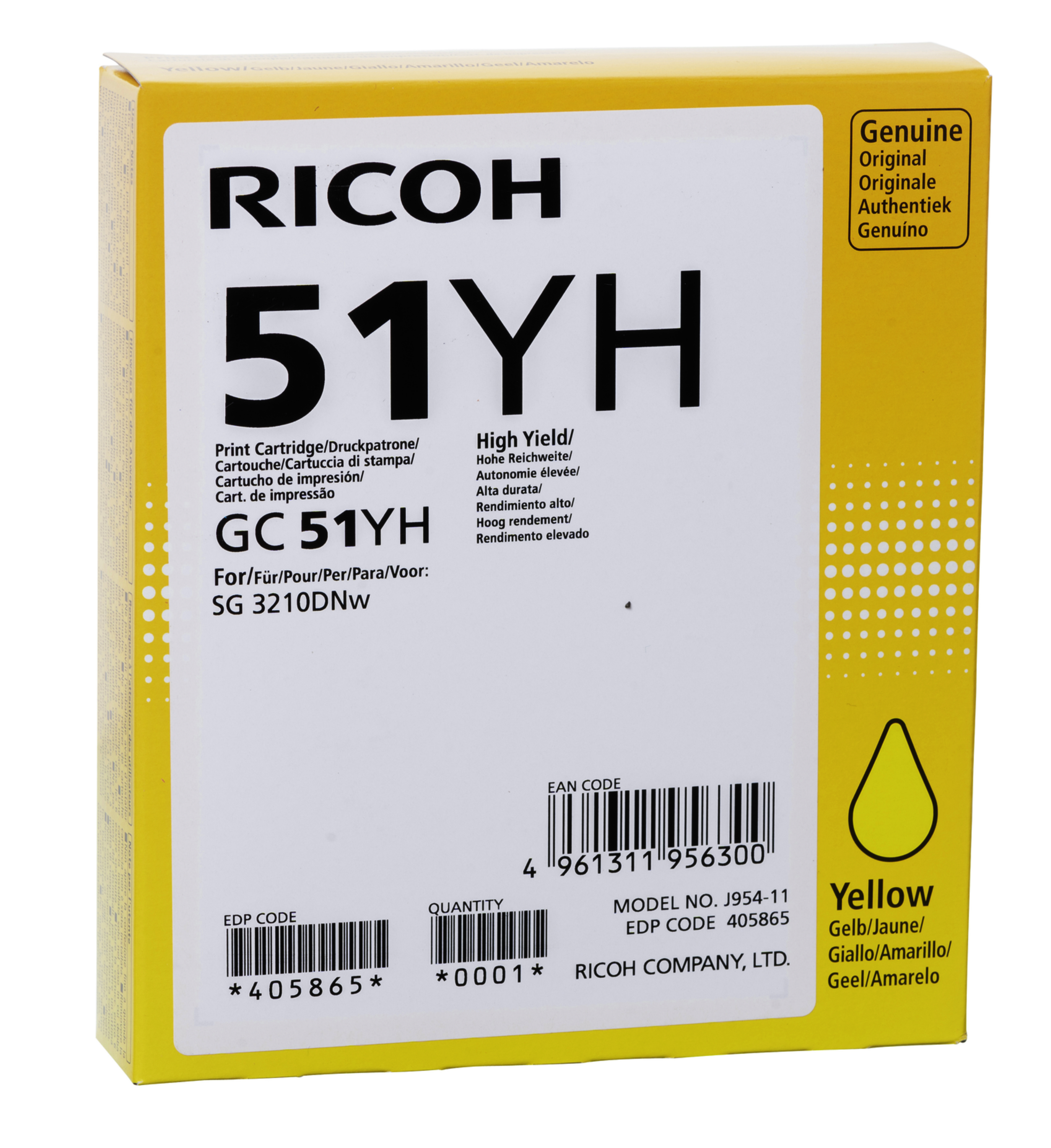 A sárga 405865 számú tintapatron a Ricoh eredeti fogyóeszköze. Ez a tintapatron a GelJet sorozat SG 3210DNw nyomtatójához alkalmas. A hatótávolságuk eléri a 2500 oldalt (ISO).