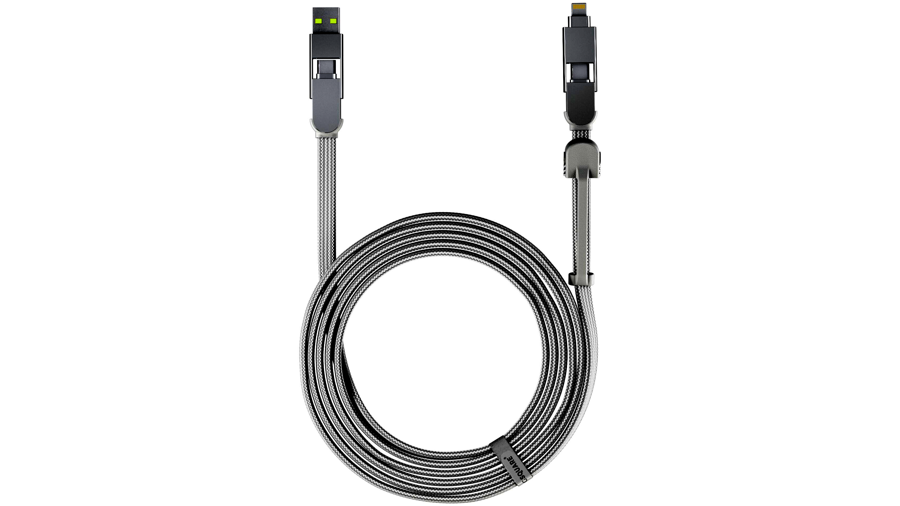 A többtöltő kábel csatlakozóinak háza cinkből készült, míg a kábel külső burkolata nylonból és TPU-ból áll. A belső magok aramid szálakból készülnek, amelyeket 200 fonott rézhuzal vesz körül, elősegítve a gyors áramáramlást. A minimalista és rendezett munkahely érdekében a kábel kombinálható a hozzá tartozó mágneses kábelrendezővel, amely lehetővé teszi a csatlakozók mágneses rögzítését, vagy a kábel rendezett elhelyezését a munkaasztalon.