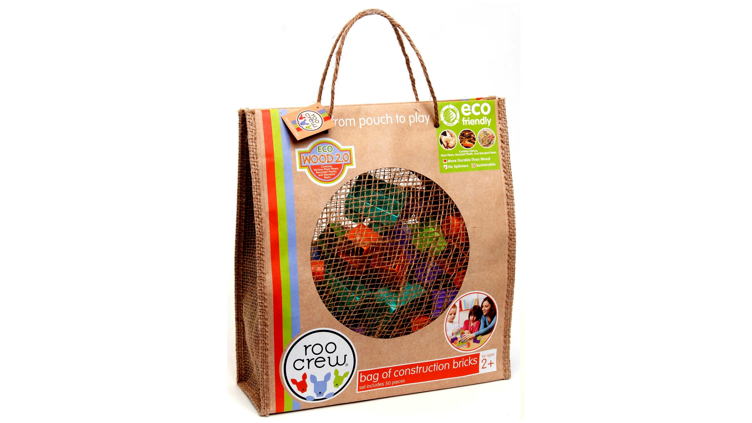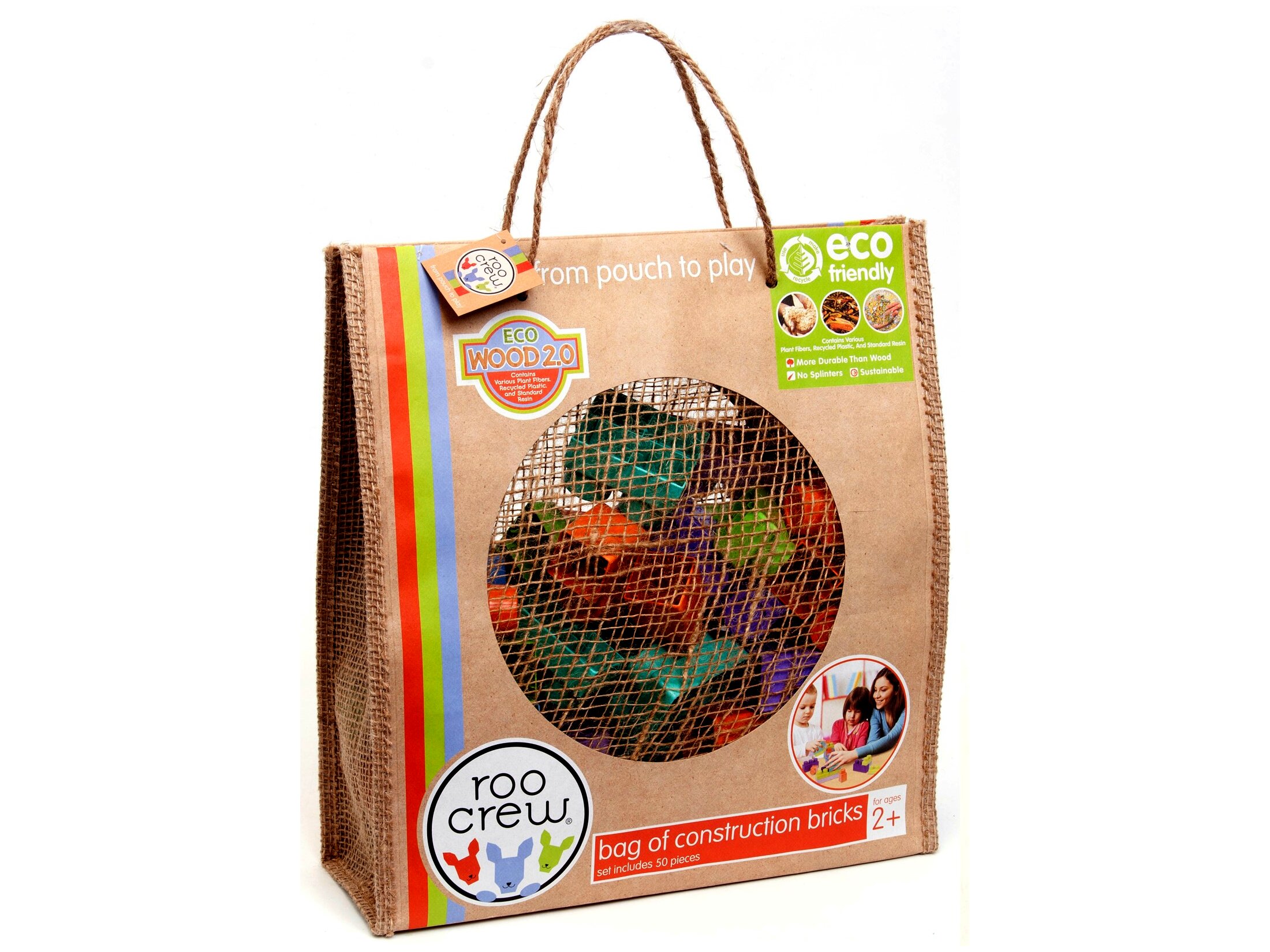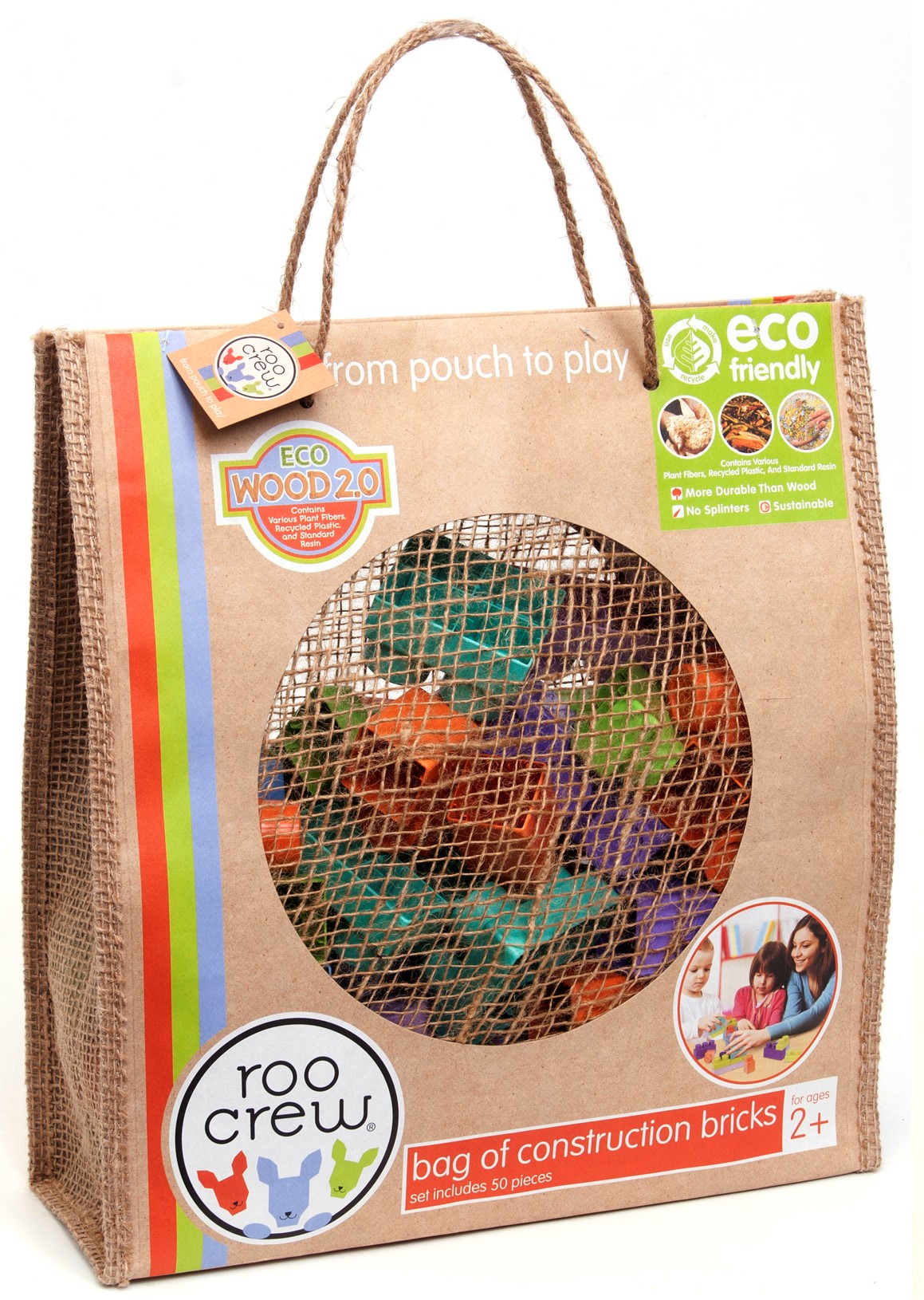 A Roo Crew termékek Eco Wood fantázianévre keresztelt anyagból készülnek, amely újrahasznosított műanyag, növényi származékok és gyanta keveréke. Ezek az építőkockák tartósabbak, szálkamentesek, és nem kopnak az idő múlásával, szemben a hagyományos fából készült játékokkal. Moshatóak és hosszú távon is megőrzik élénk színüket és formájukat.