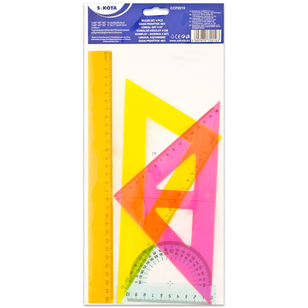 Műanyagból készült, 4 db-os vonalzó készlet neon színekben. A csomagban 2 db háromszög vonalzó, egy hosszú vonalzót és egy szögmérőt találhatsz. Az egyenes vonalzó hossza: 30 cm, a háromszög vonalzók hossza: 16 cm és 21 cm, a szögmérő vonalzórészének hossza: 10 cm.