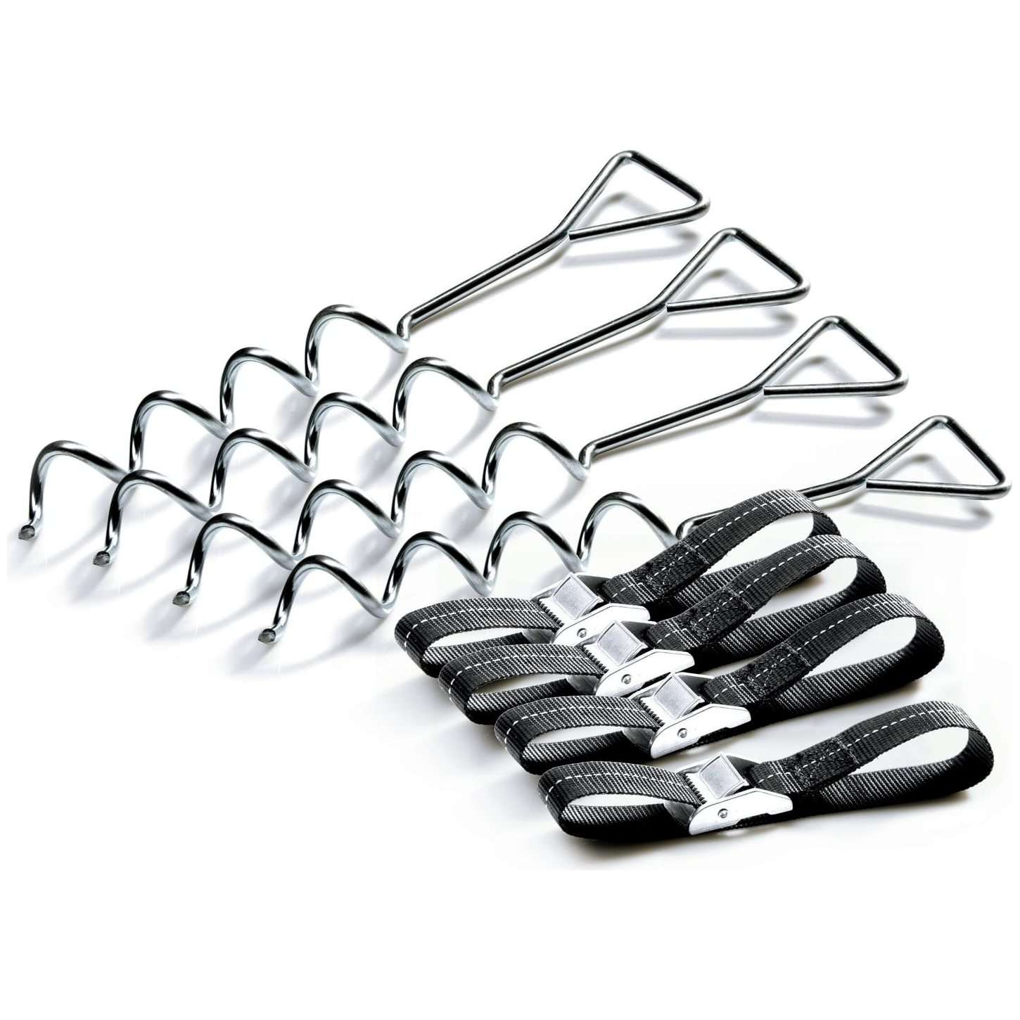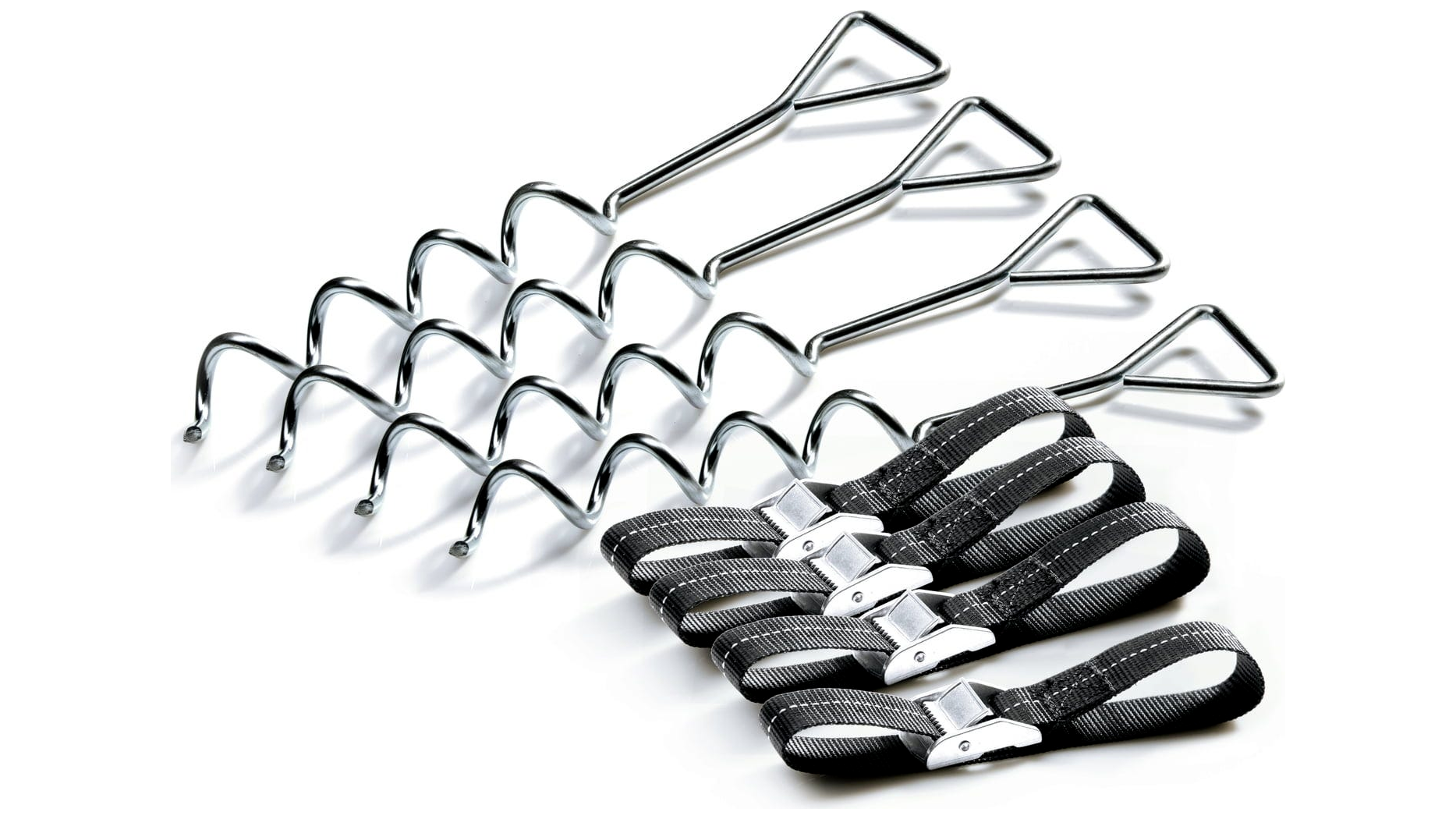 Tartozékok a készletben: 4 db horganyzott talajhorgony (spirál kialakítású), 4 db időjárásálló feszítőpánt robusztus fém rögzítőkkel