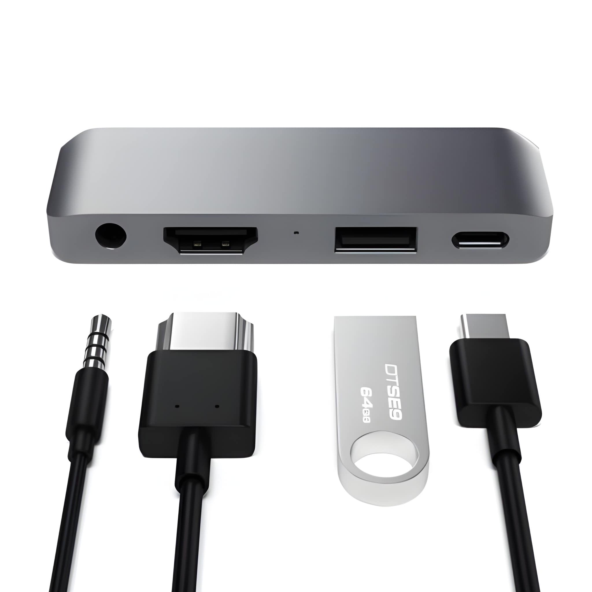 4 az 1-ben csatlakozás – 4K HDMI videokimenet, USB‑C PD töltés, USB‑A 3.0 port és 3,5 mm‑es audio jack egyetlen kompakt adapterben.