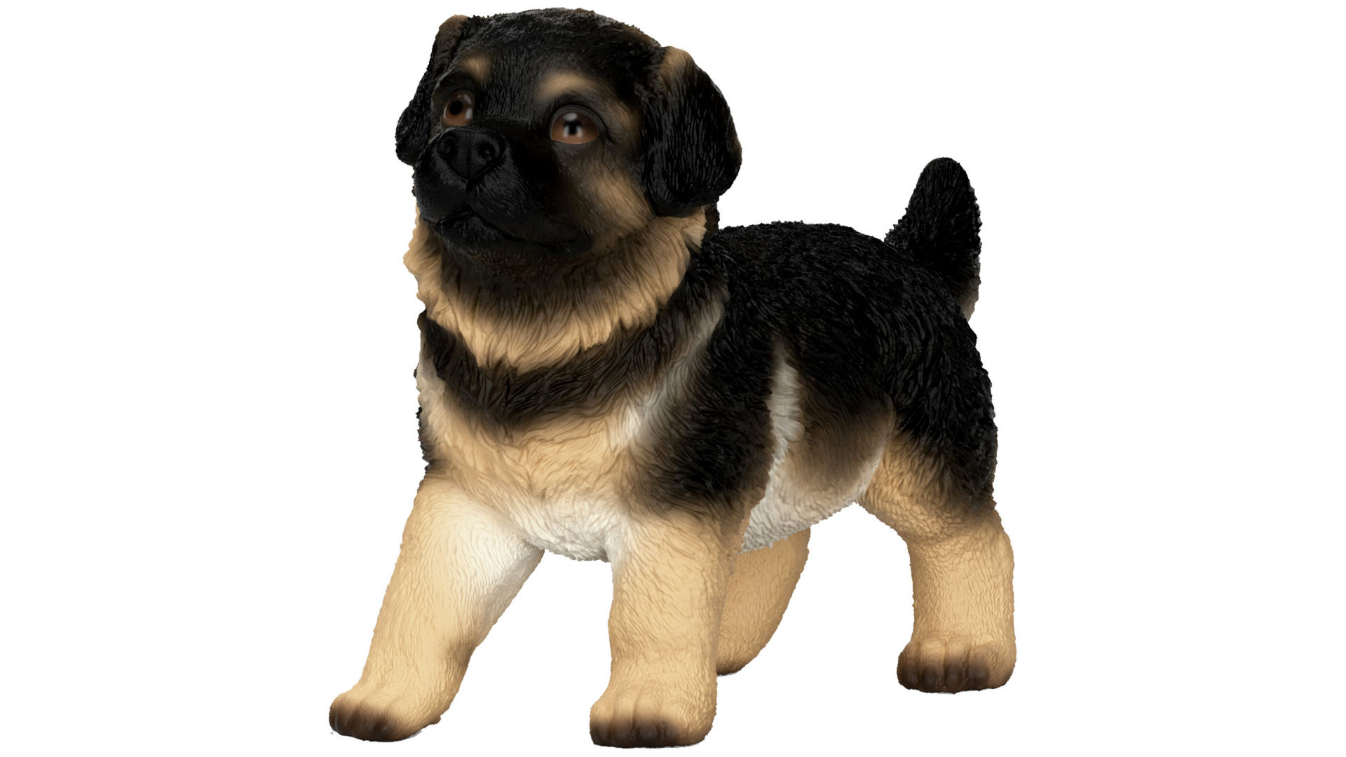 A német juhászkutya világszerte ismert intelligenciájáról és munkabírásáról. Eredetileg terelőkutyának tenyésztették, ma pedig gyakran látni rendőrségi, mentő- és keresőkutyaként, valamint segítőkutyaként is. Kölyökkorban különösen élénkek és kíváncsiak, gyorsan tanulnak, és már fiatalon megmutatkozik problémamegoldó képességük – ezt az élénk, érdeklődő jelleget tükrözi vissza a játékfigura megjelenése is.