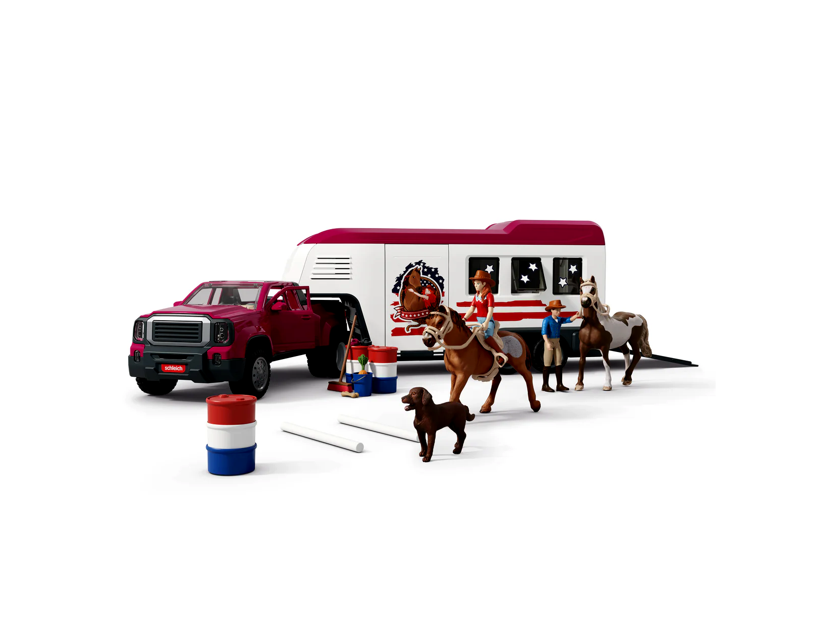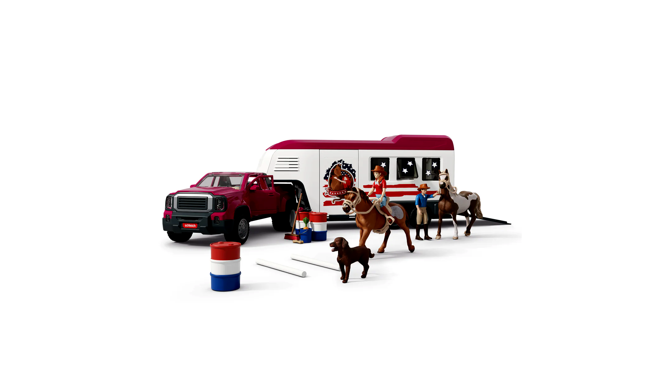 A nagy ikerkerekes Dually teherautó tökéletesen alkalmas arra, hogy elvigye az összes szükséges felszerelést a Western kalandhoz: nyergek, kantár, curry fésű, ápolókefe, vödör, víztömlő és természetesen a cowboy kalapok sem hiányozhatnak a csomagból. A teherautó és pótkocsija elegendő helyet biztosít az összes szükséges felszerelésnek és a lovaknak is. Az utánfutó teteje menedékként is használható egy kis pihenő során.