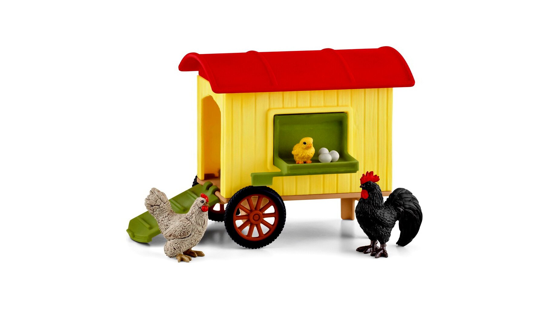 Kukurikú! Mit kukorékol a kakas? Ez a Schleich Farm World mobil csirkeház játékkészlete! A tyúkanyó egy kis friss levegőre vágyik... nyissuk ki a tyúkólat, hogy szabadon kószálhasson. Két exkluzív játékcsirkét tartalmaz, amelyek csak ehhez a játékkészlethez kaphatók, valamint a tyúkólat, egy játékcsirkét és még néhány apró tyúktojást is.