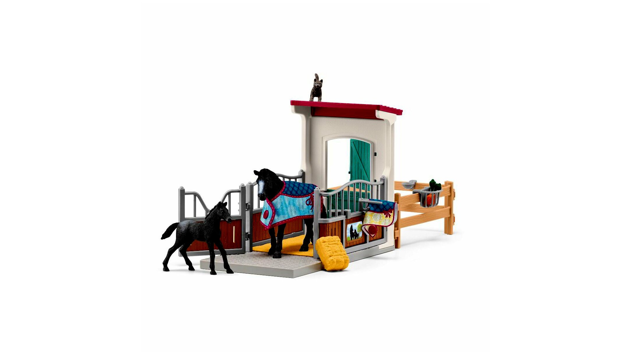 A nyereg és a kantár eltávolítható és a nyeregtartóra helyezhető. A paddockban a lovak friss levegőt kapnak. A moduláris felépítésnek köszönhetően a lovas doboz könnyen kombinálható a HORSE CLUB világ más készleteivel.