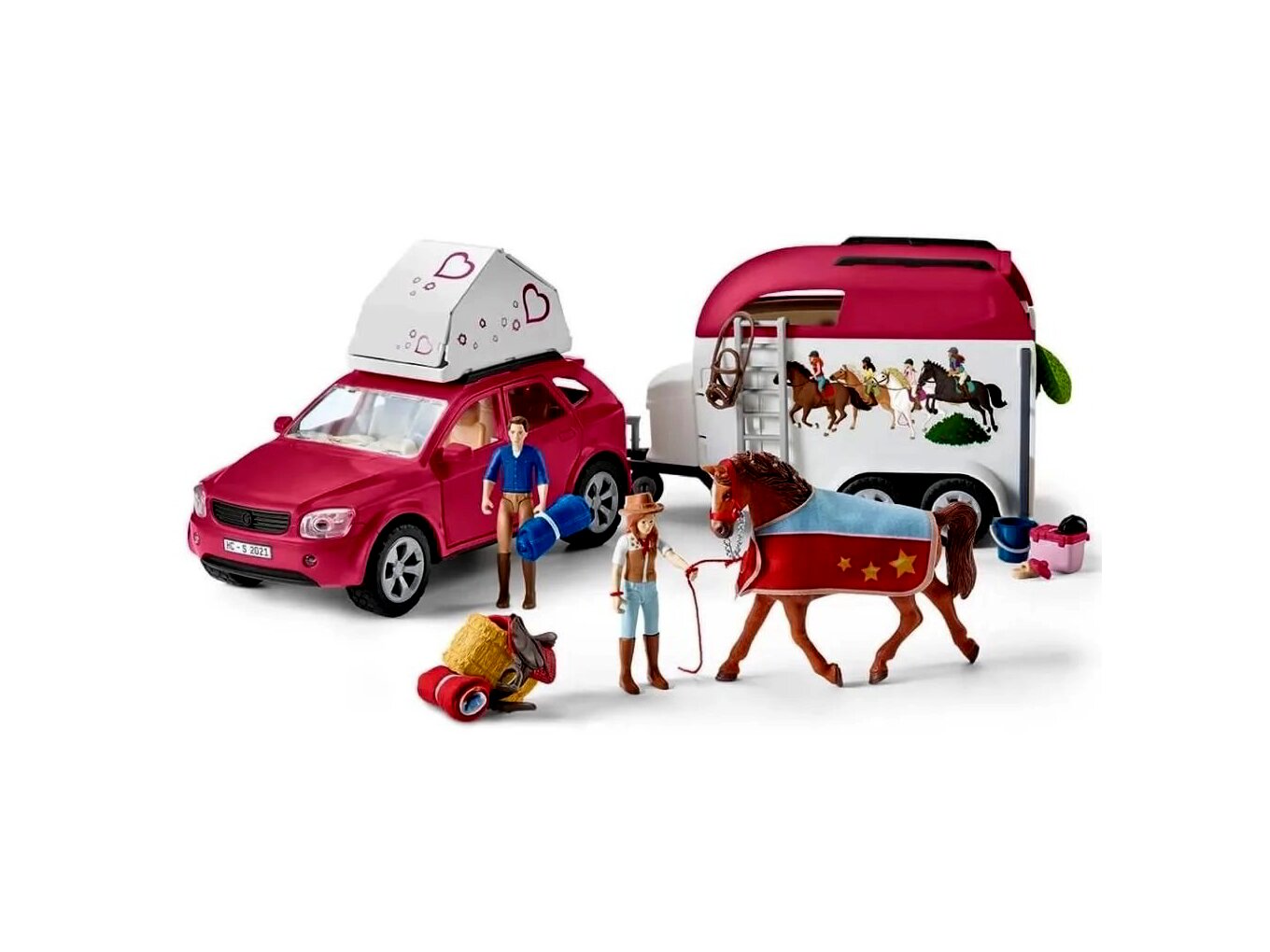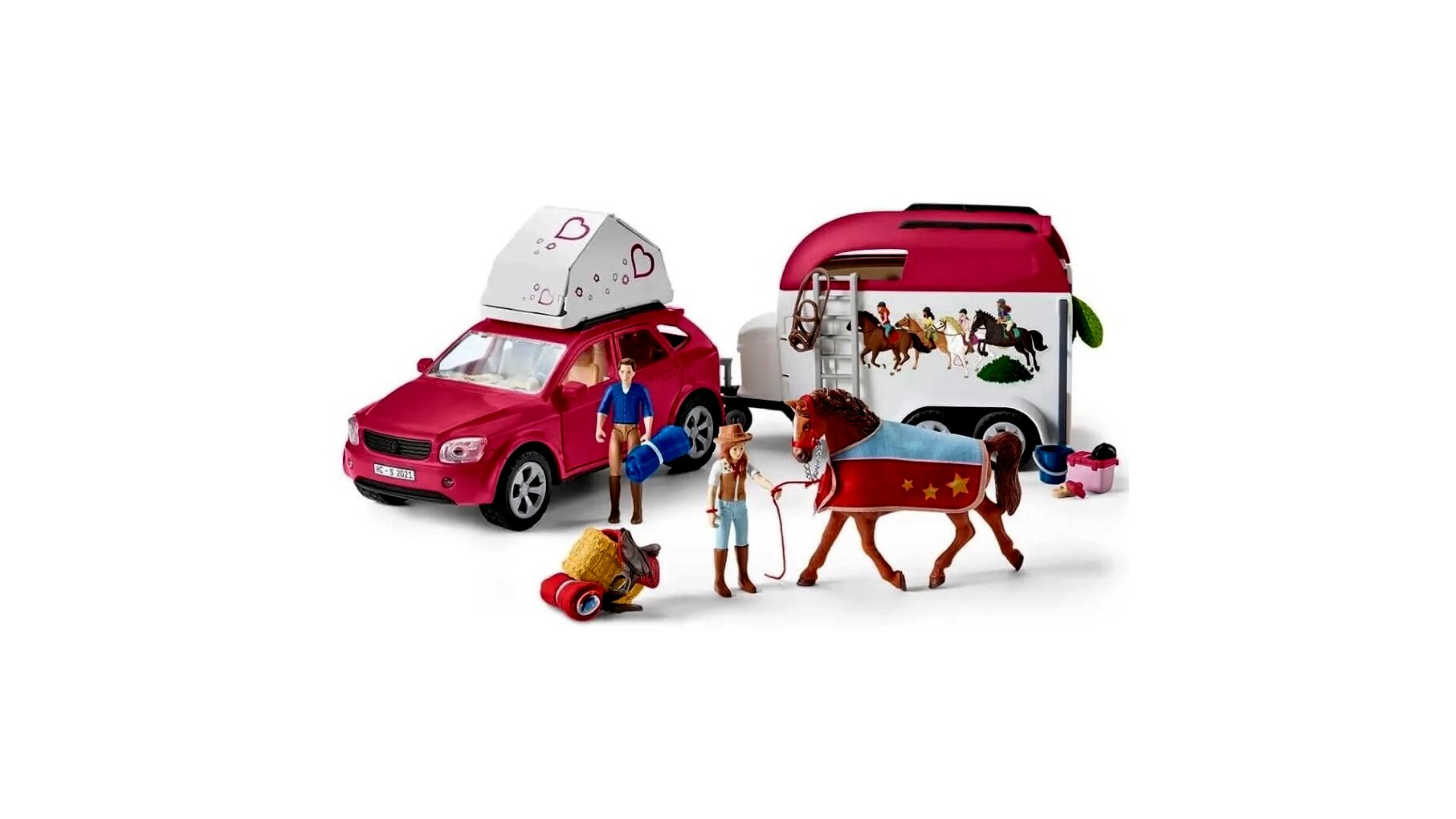 A ló kényelmesen elhelyezkedett az utánfutóban... a kocsi bepakolva... induljunk útnak! LOVASKLUB Hannah és holsteini kancája készen állnak egy lovas kalandra apával. Nagyszerű történetek születnek az országúti kirándulásokon! Ez a játékkészlet 5 éves kortól alkalmas gyerekeknek és a lovak szerelmeseinek.