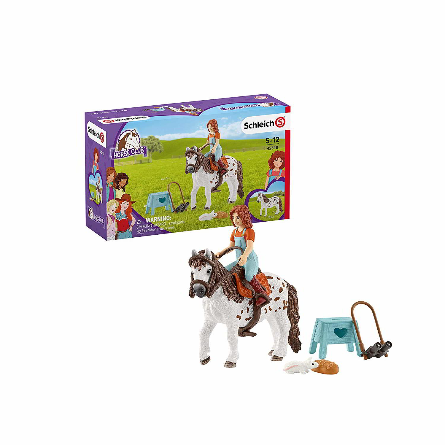 A Schleich: Horse Club - Mia és Spotty készletben helyet kapott Mia és kedvenc lova, Spotty, valamint apró kiegészítők is.