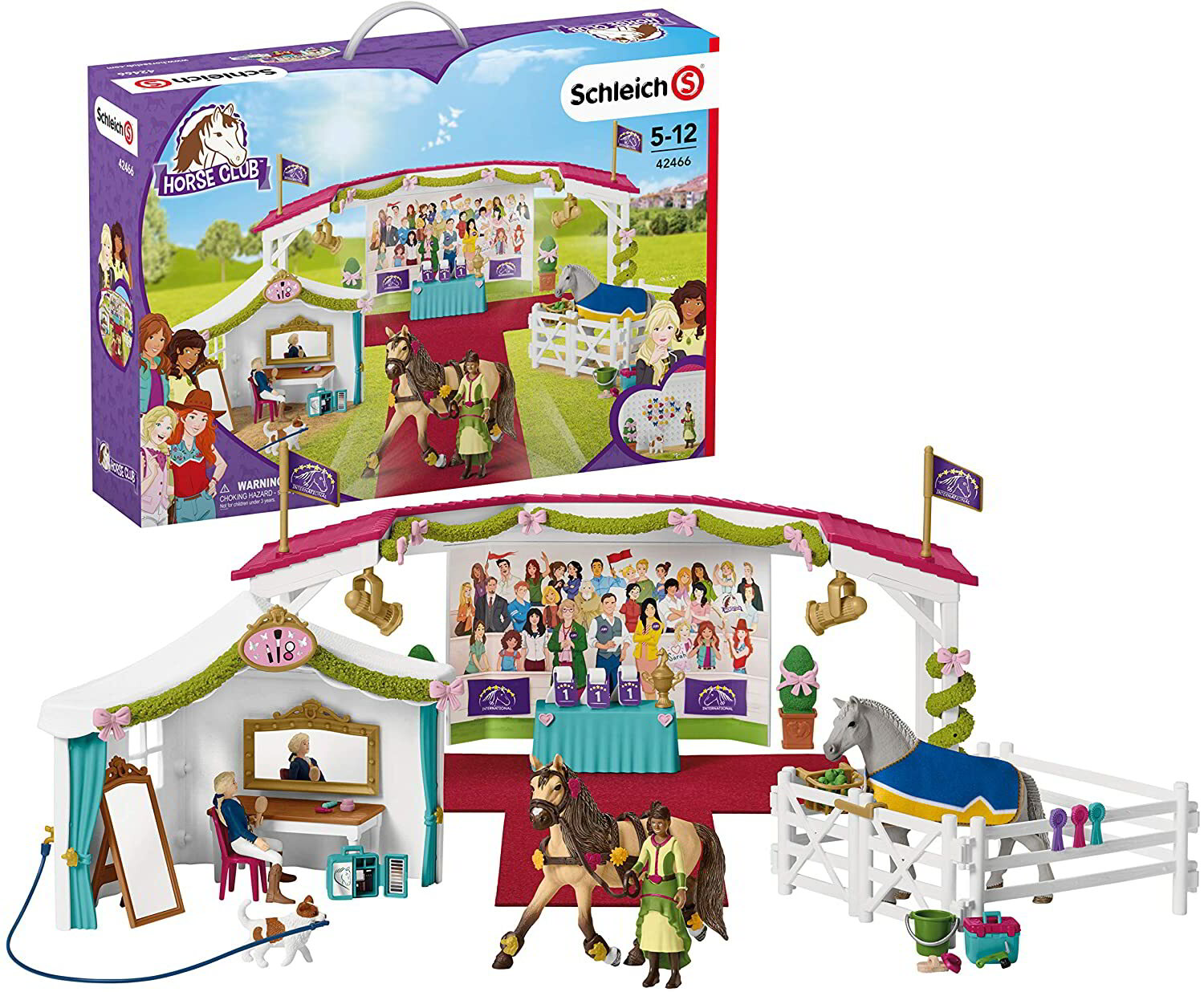A lovak szerelmeseinek egyik legnépszerűbb játéka, a Nagy Lovas Show játékkészlet a schleich®-tól egy öltözősátrat, két lovas figurát, két show-ló figurát, egy show-arénát, karámokat, dekorációkat, díjakat és több mint 100 kiegészítőt tartalmaz. Nagyszerű ajándék 5 éves kortól a lovak szerelmeseinek!