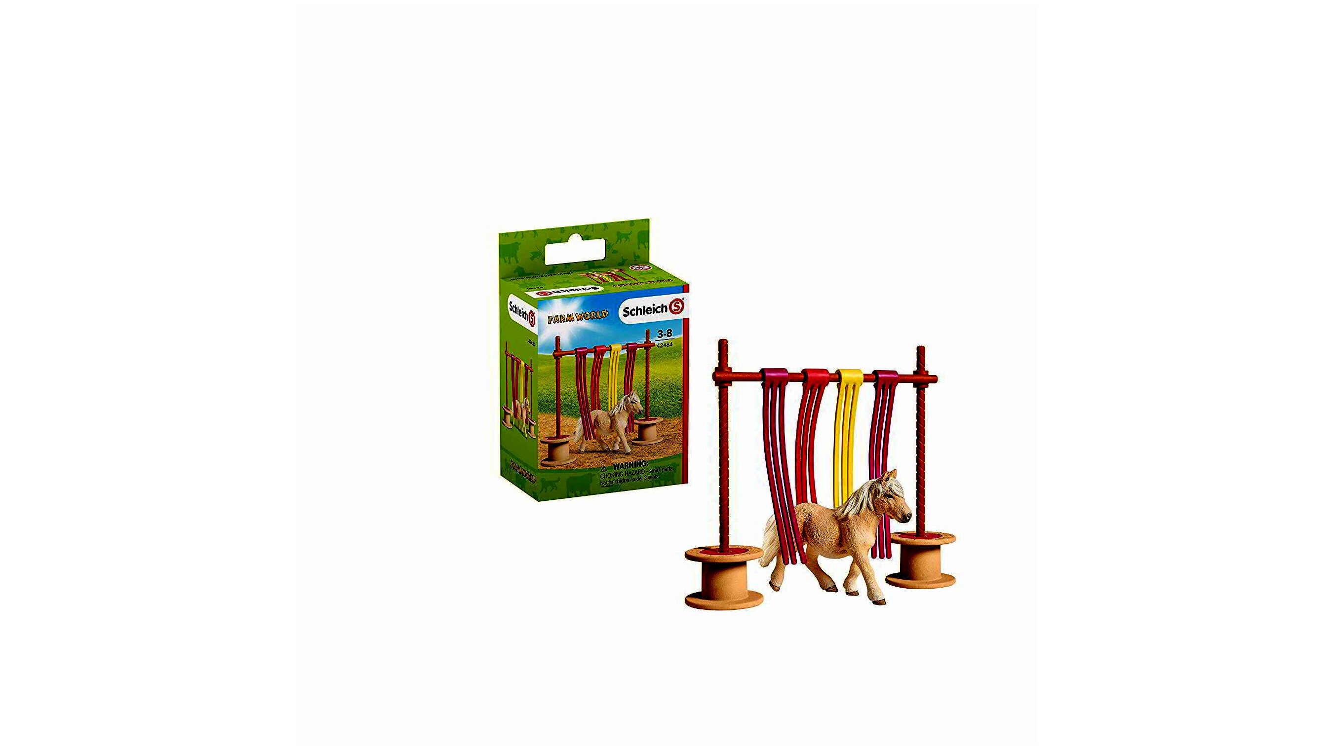 A póni akadályfüggönnyel a póni megtanulja, hogy bátor legyen, ne féljen a zászlóvivőktől, és a szalagoktól. A legtöbb póni nagyon fél tőlük, és néha megugrik. Amikor mozog a függöny, a póni megszokja. Átmenni ezen a függönyön egy fontos gyakorlat, hogy a póni ne féljen.Tartalom: 1 x Shetland póni, 2 x emelvény, 2 x oszlop, 1 x keresztrúd, 4 x függöny, 1 x matrica. Mérete: 9 x 5,7 x 13,7 cm.