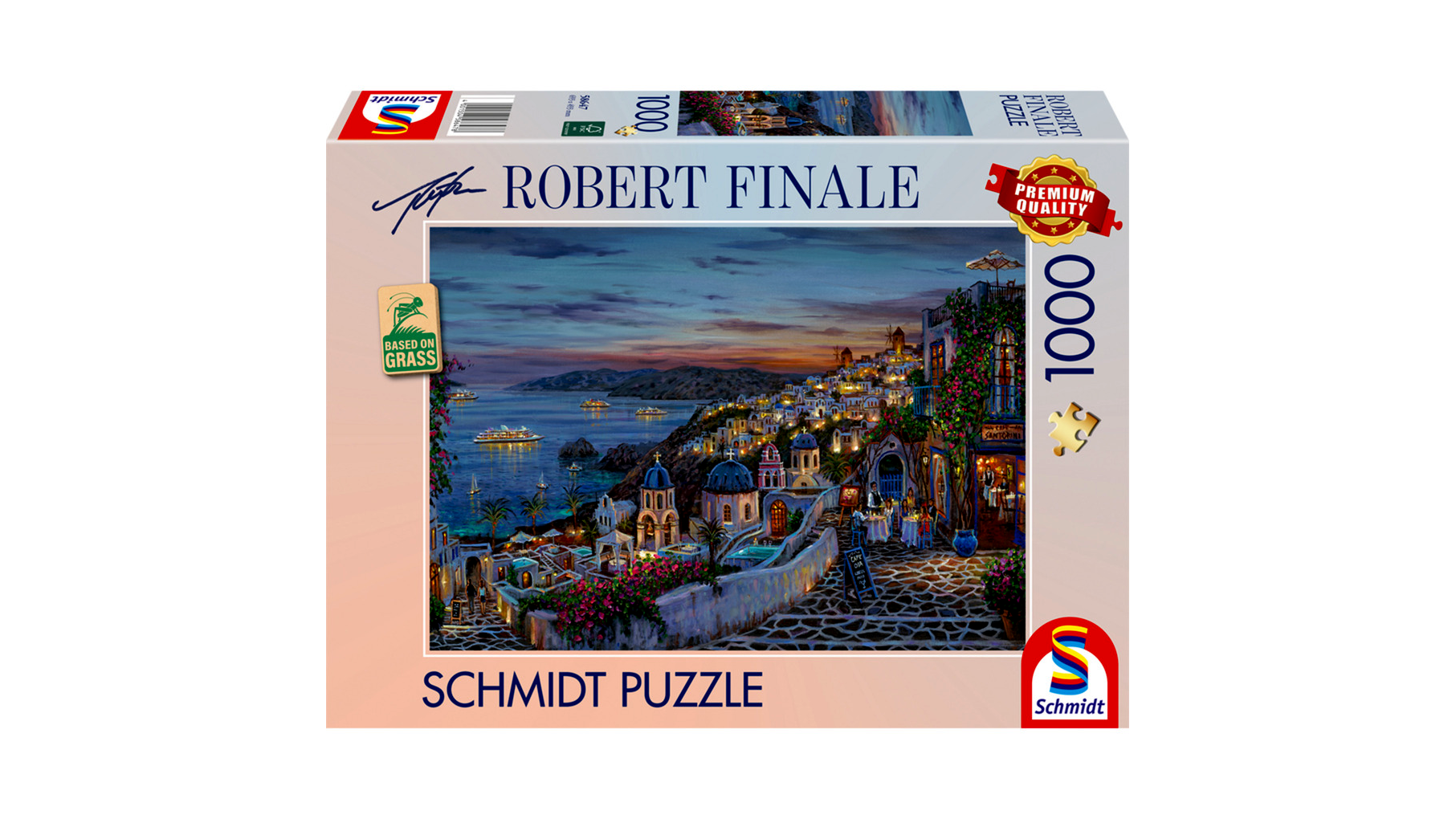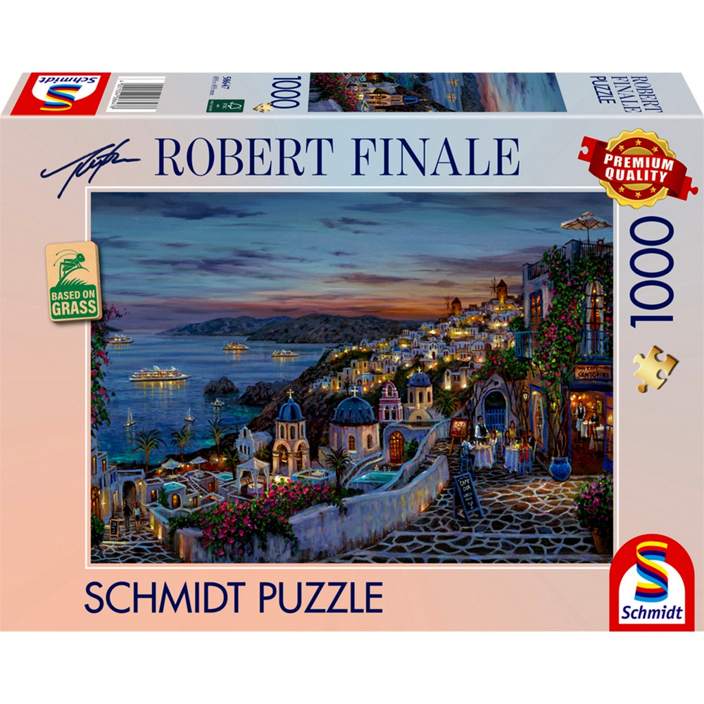 A kirakó képe Robert Finale hangulatos festményén alapul, amely Santorini egyik jellegzetes, esti pillanatát örökíti meg. A lenyugvó nap fényei, a házak fehér falai, a tenger mély árnyalatai és az apró részletek mind hozzájárulnak ahhoz, hogy a kész kép dekoratív dísze lehessen a lakásnak – akár bekeretezve is.