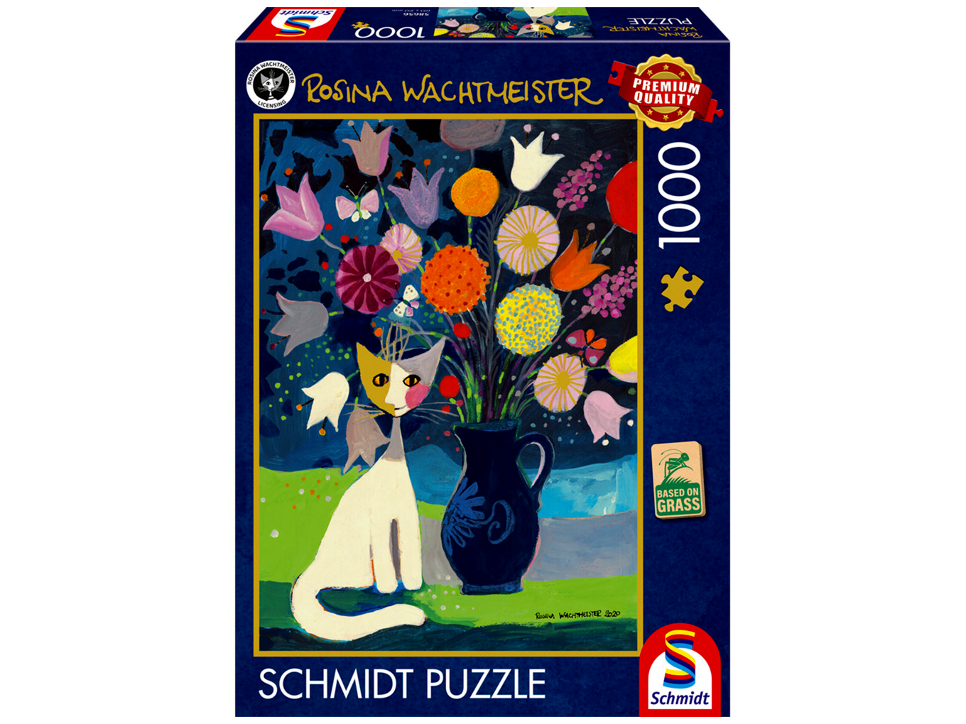 Ez a különleges, 1000 darabos művészi kirakó egy fehér macska és egy színes virágcsokor bájos kompozícióját jeleníti meg, Rosina Wachtmeister jellegzetes, lírai stílusában. A kép hangulata egyszerre elegáns és játékos, így a kirakás élménye nem csak kikapcsolódás, hanem valódi esztétikai élvezet is.
