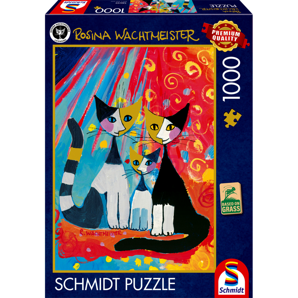 A Schmidt Spiele egyik legkülönlegesebb kirakója ez a 1000 darabos, művészi hangulatú puzzle, amely Rosina Wachtmeister jellegzetes stílusát és egy boldog, színes macskacsalád meghitt pillanatát örökíti meg. A részletgazdag grafika, a gazdag színek és a minőségi kivitelezés együtt igazán élvezetes, elmélyült kirakós élményt nyújt tizenéveseknek és felnőtteknek egyaránt.