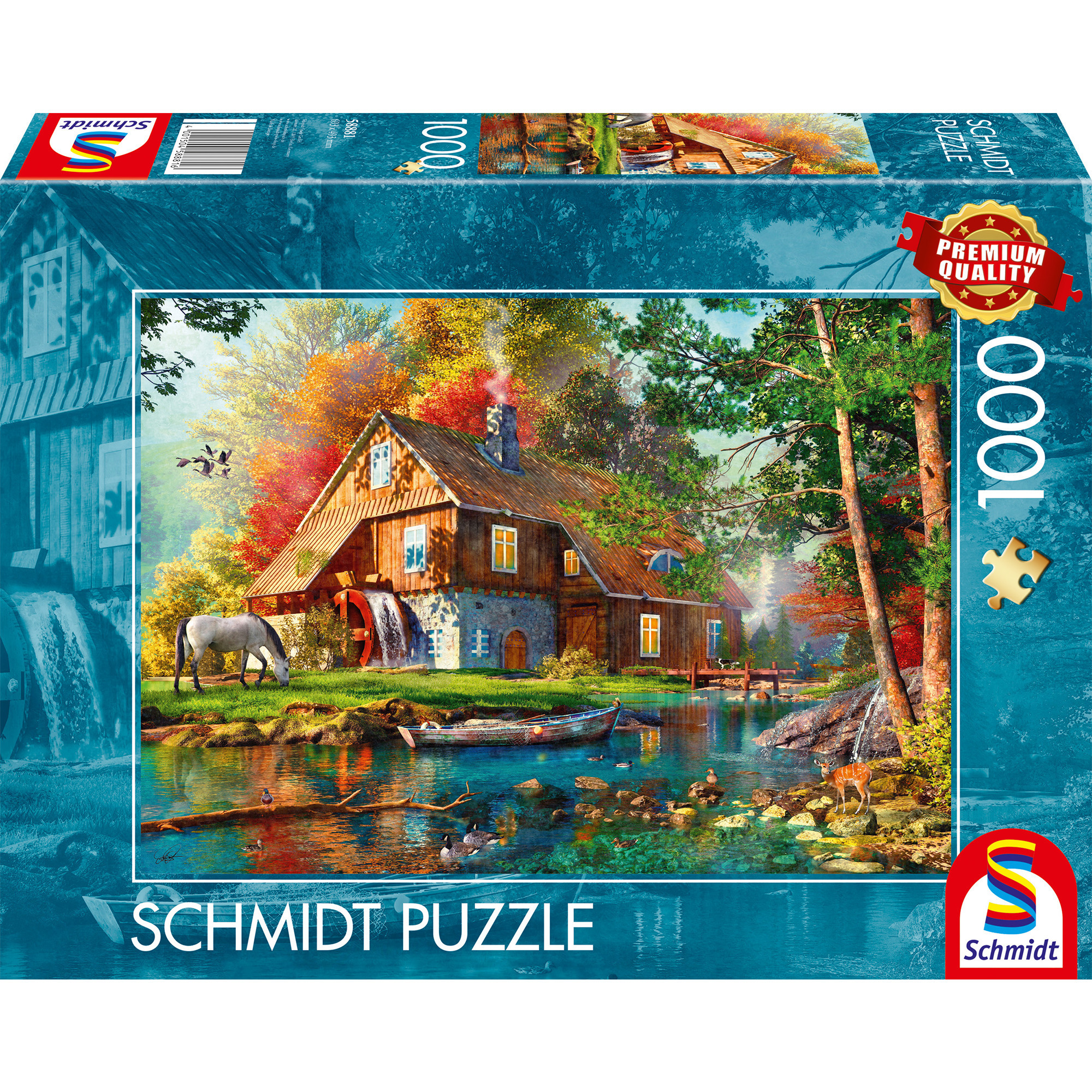 A Schmidt Spiele prémium minőségű kirakói között ez a gyönyörű, 1000 darabos kirakó igazi különlegesség: egy festői őszi jelenetet ábrázol vízimalommal, patakkal és egy békésen álldogáló lóval a vidéki tájban. A meleg őszi színek, a részletgazdag grafika és a minőségi kidolgozás együtt igazán élvezetes és pihentető kirakózási élményt nyújtanak.