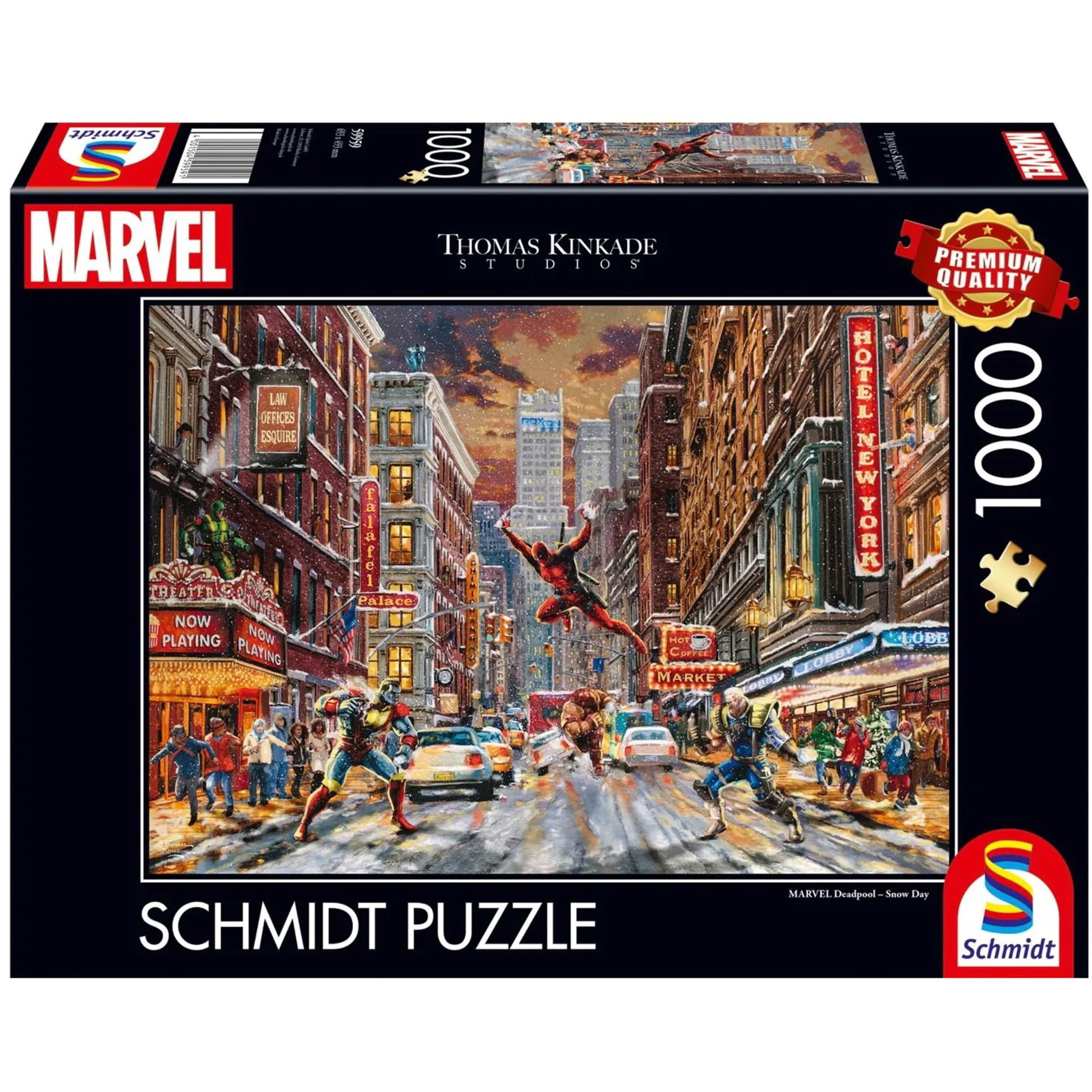 A Schmidt Spiele 59959 számú kirakója, a Thomas Kinkade Studios Marvel - Deadpool, Snow Day Puzzle, a téli szórakozás és a szuperhős kalandok világát egyesíti. A népszerű amerikai festő, Thomas Kinkade által inspirált kép most darabonként kel életre, amikor Deadpool egy mókás és havas napot tölt.