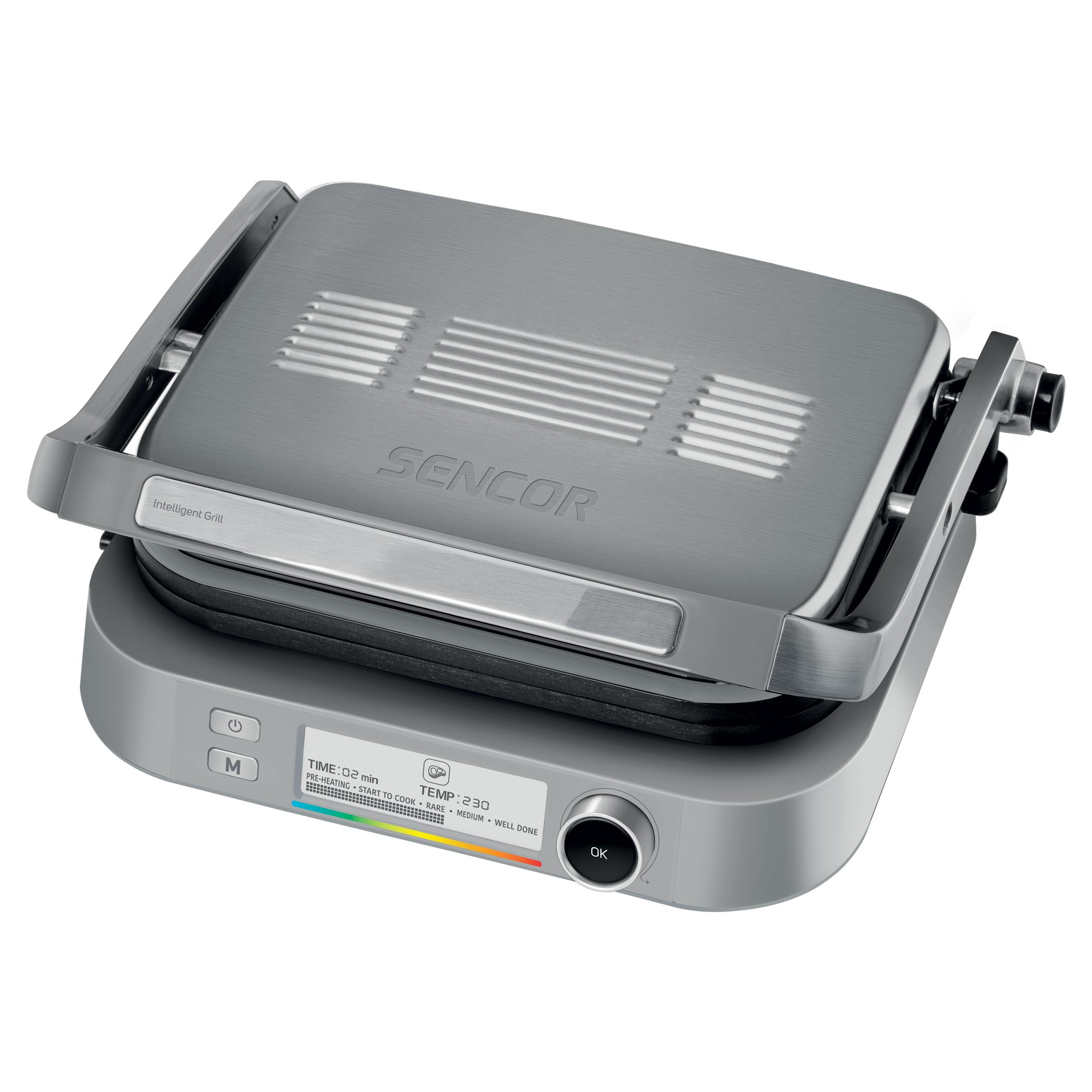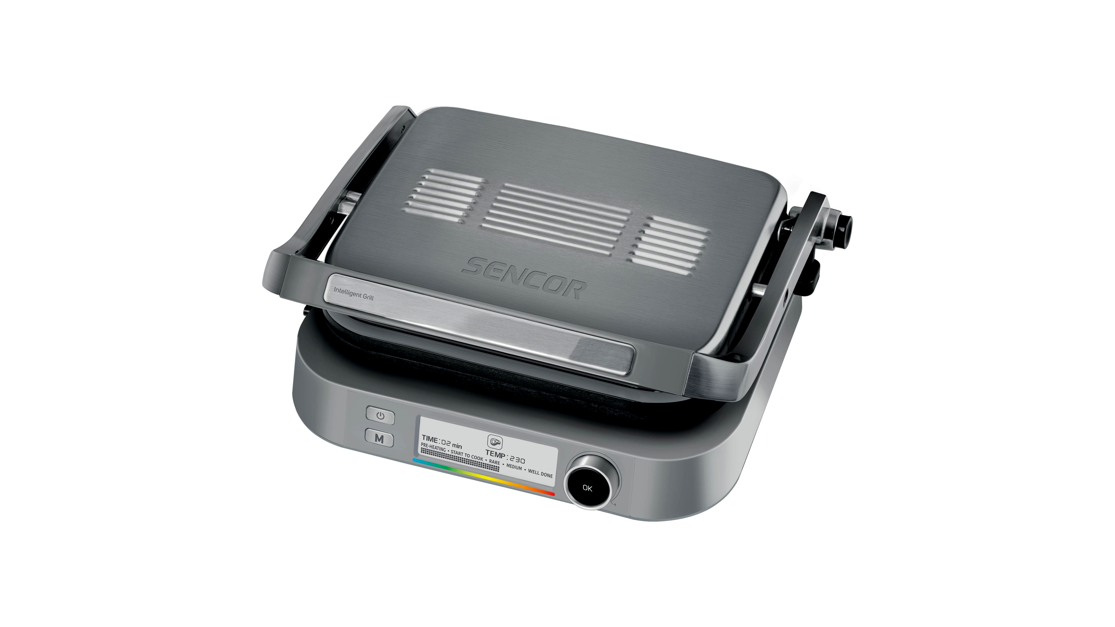 A Sencor SBG 6231SS kontaktgrill időtlen, nemesacél kivitelben digitális vezérléssel, 3rd Generation tapadásmentes grillsütő lapokkal és beépített fűtőszállal. A grillsütő 3 helyzetben működtethető. Használható 90°-ban, ilyenkor csak egy grill lapon van lehetőség sütni, de több alapanyag sütéséhez nyissa ki 180°-ban így mindkét sütőfelület használható. Ha pedig egyszerű melegszendvicset vagy panninit készíteni akkor egyszerűen a grillezendő alapanyagra zárja a fedelet. A Sencor grillsütőben a paralelogramma mechanizmus biztosítja az egyenletes nyomást. A hőmérséklet-szabályozás automatikus. A grillsütő csupán néhány perc alatt megtisztítható, illetve a sütő lemezek mosogatógépben moshatók.