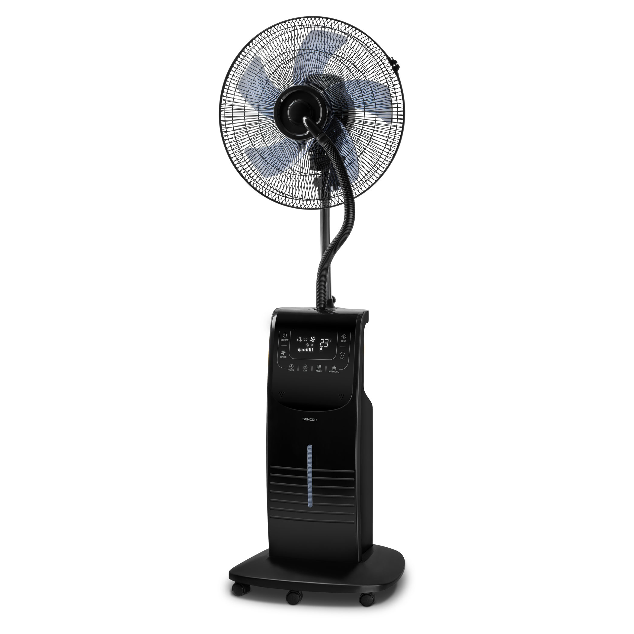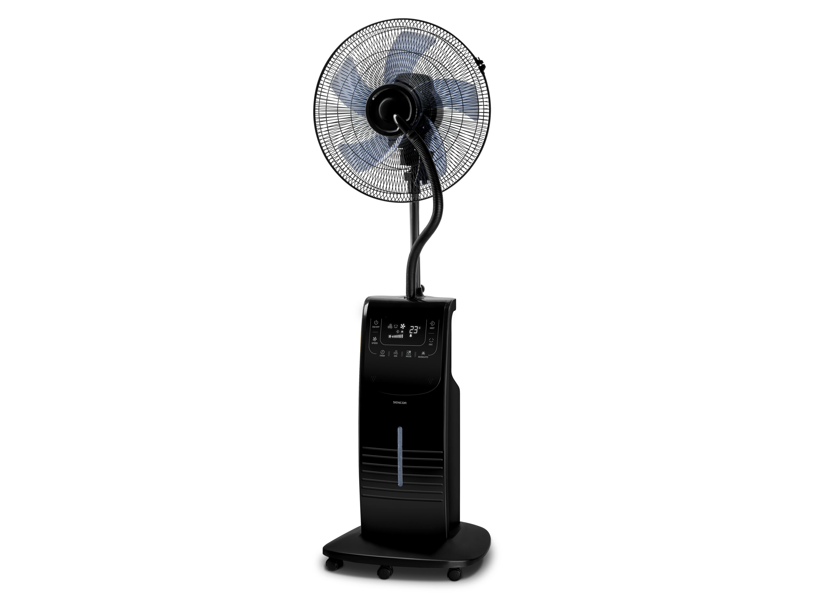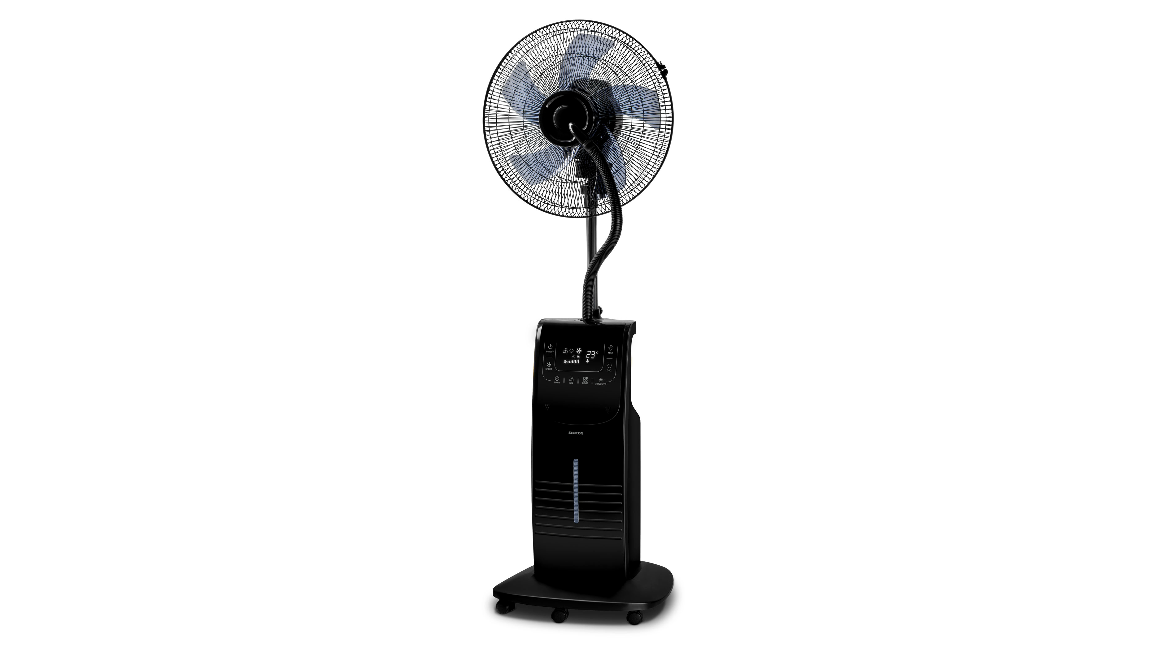 A ventilátor beépített vízpára permetező funkcióval rendelkezik, amely akár 200 ml/óra párásítást biztosít, így növelve a komfortérzetet. A 3,1 literes víztartály szintjelzővel és hűtőbetéttel van felszerelve, ami hosszabb ideig tartó működést biztosít. Emellett a szúnyogriasztó rekesz, aromadoboz és ionizátor hozzájárul a kellemesebb és egészségesebb környezethez.