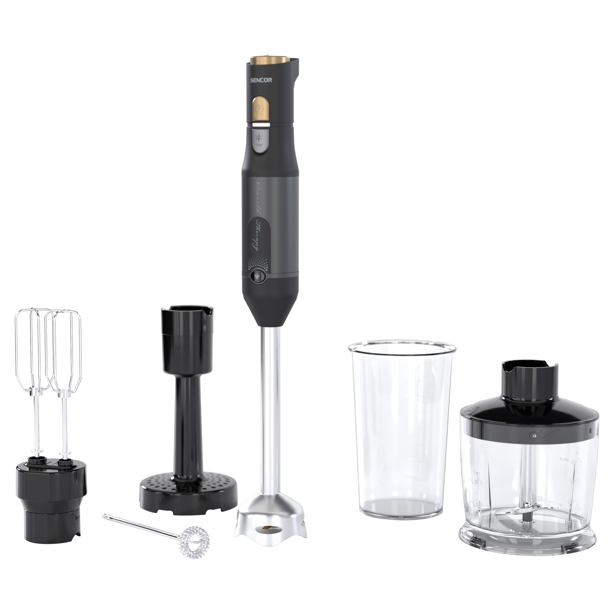A Sencor SHB 6442BK botmixer krémlevesek, szószok, bébiételek gyors elkészítésében nyújthat Önnek segítséget. Az 1200 W teljesítményű motor változtatható sebesség funkcióval lett ellátva. A Titanium Quad Blade Technológia alapján készült aprító pengék pedig forró ételek készítésére is alkalmasak. Az ergonomikusan kialakított markolat biztos és kényelmes fogást garantál. Az 800 ml-es fedeles keverőpohár segítségével nagy mennyiségű alapanyag is feldolgozható vagy akár mérőedényként is használható, továbbá megtalálható egy 500 ml kapacitású edény is, mely aprításra kiválóan használható. A kiegészítők között megtalálja még a tejhabosító fejet, melynek segítségével, tökéletes állagú tejhabot készíthet, valamint egy krumplitörőt fejet is, amivel könnyedén készíthet burgonyapürét.