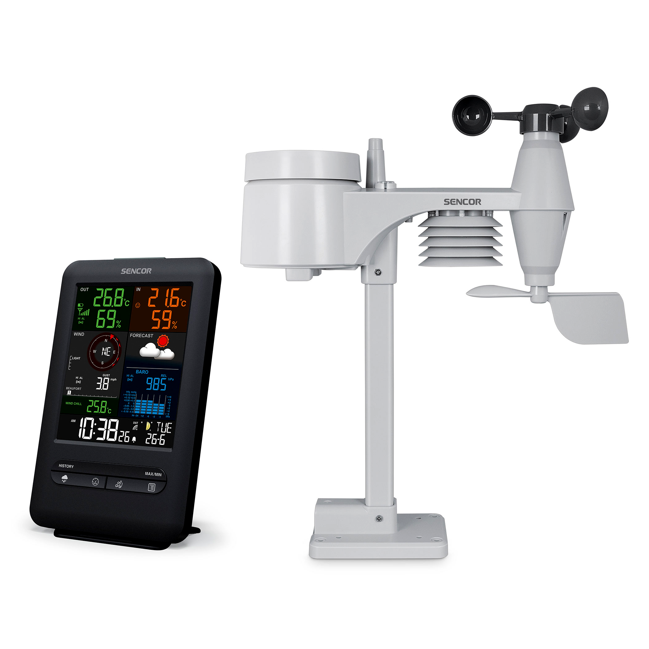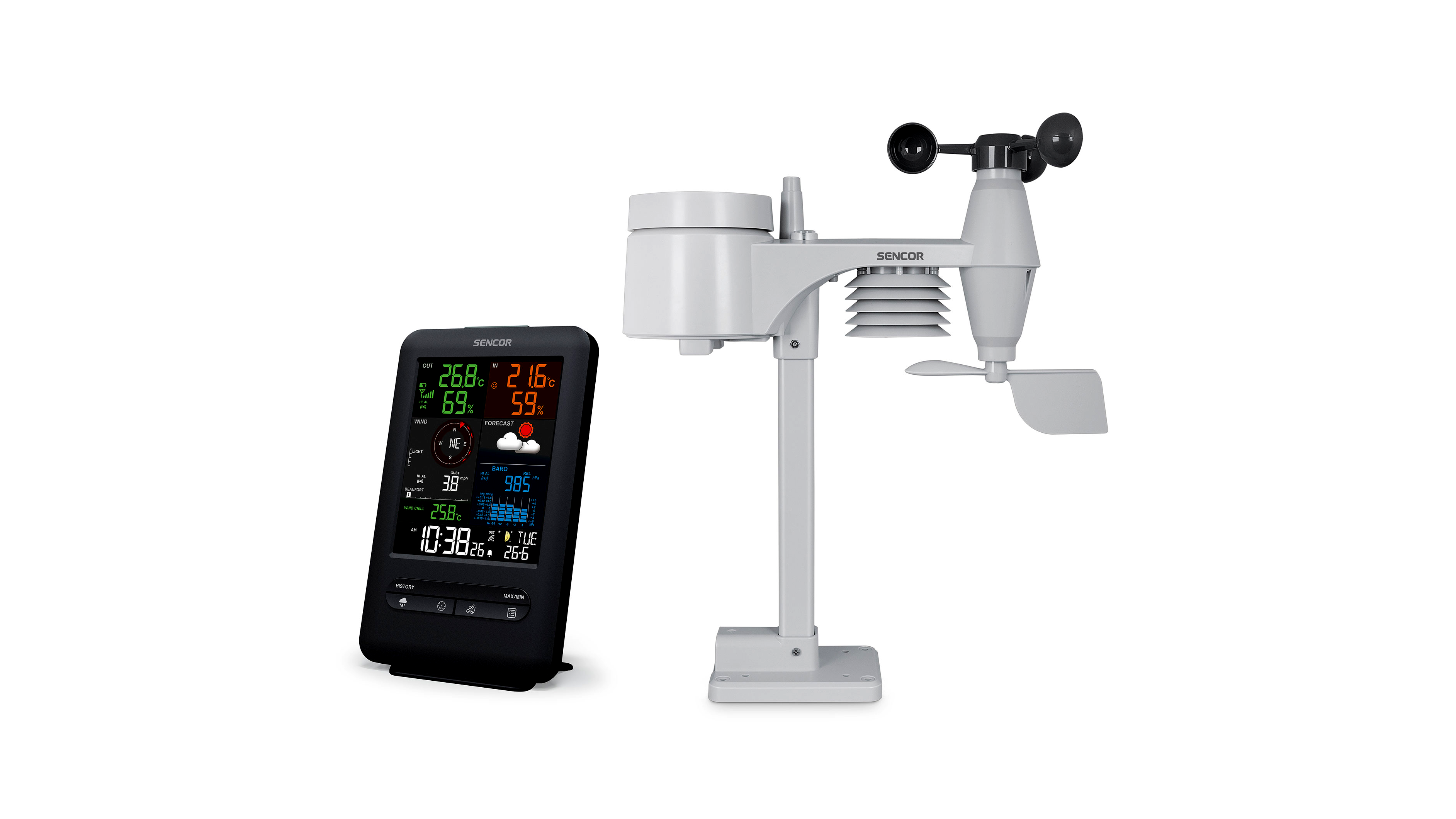 A professzionális Sencor SWS 9300 meteorológiai állomás egyedi több színű 5,4” kijelzővel rendelkezik. A standard funkciókon túl, mint a külső és belső hőmérséklet és páratartalom mérésen felül számos extra funkcióval rendelkezik. Az állomás 24 órás időjárás előrejelzést ad és felszereltségei közé tartozik a barométer, szélmérő, csapadékmérő , ónos eső előtti figyelmeztetés és nem hiányoznak a klasszikus idő funkciók sem, mint az ébresztőóra, dátum és idő berendezés DCF szignállal. Az időjárás állomás a fő egységből, illetve 5 az 1-ben vezeték nélküli érzékelőből áll, amely a szél sebességének és irányának, a lehullott csapadék, a hőmérséklet és a páratartalom mérésére szolgál. A fő egység és az érzékelő nyílt terepen akár 150 méteres távolságból is képes kommunikálni.