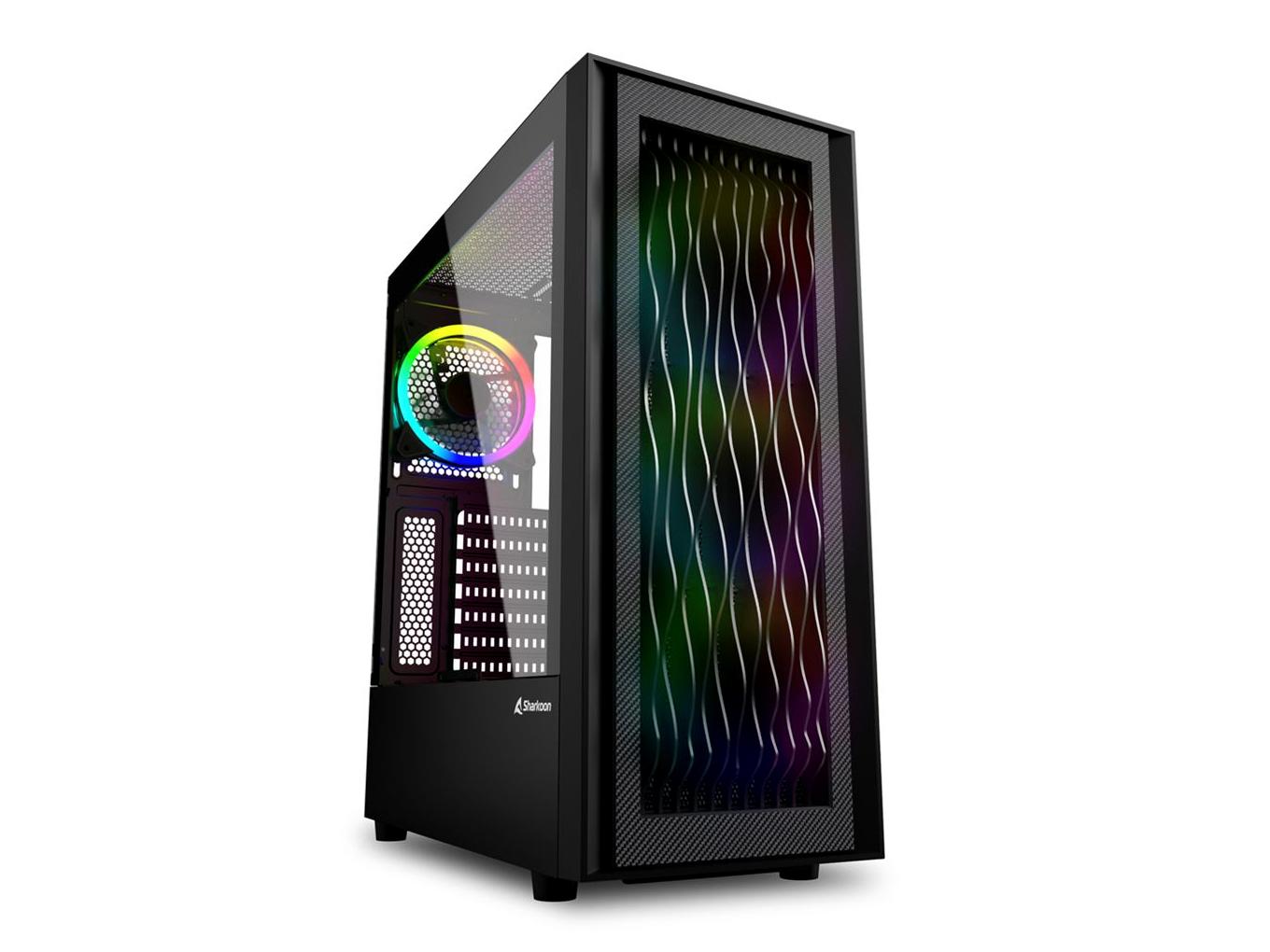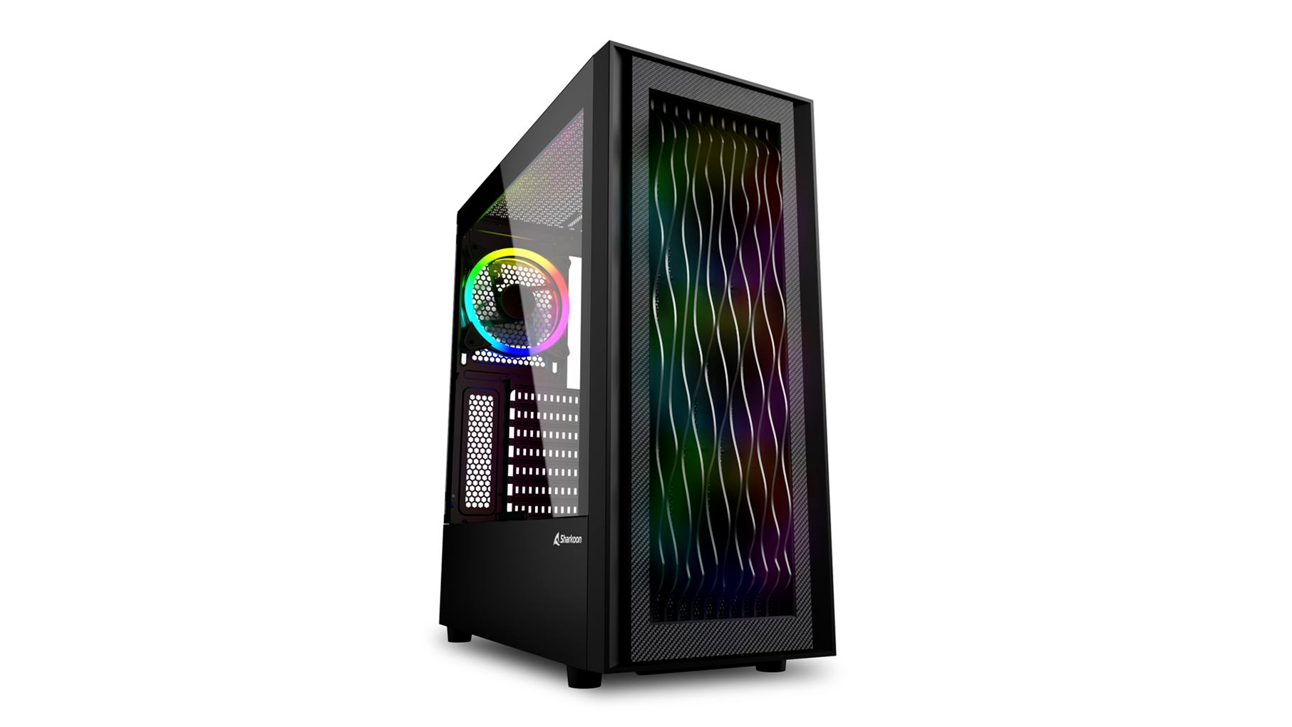 Az RGB Wave előlapja különösen szemet gyönyörködtető megjelenést kínál. A szintetikus anyagból készült csíkok végigvonulnak az előlapon, és egyedi 3D-s hullámos kialakítást kölcsönöznek a toknak. Ezt a közvetlenül mögötte előre beszerelt három 120 mm-es RGB ventilátor megvilágítása hozza előtérbe. Az utolsó simítást a hullámos dizájnt körülvevő, szénszálas textúrájú keret adja.