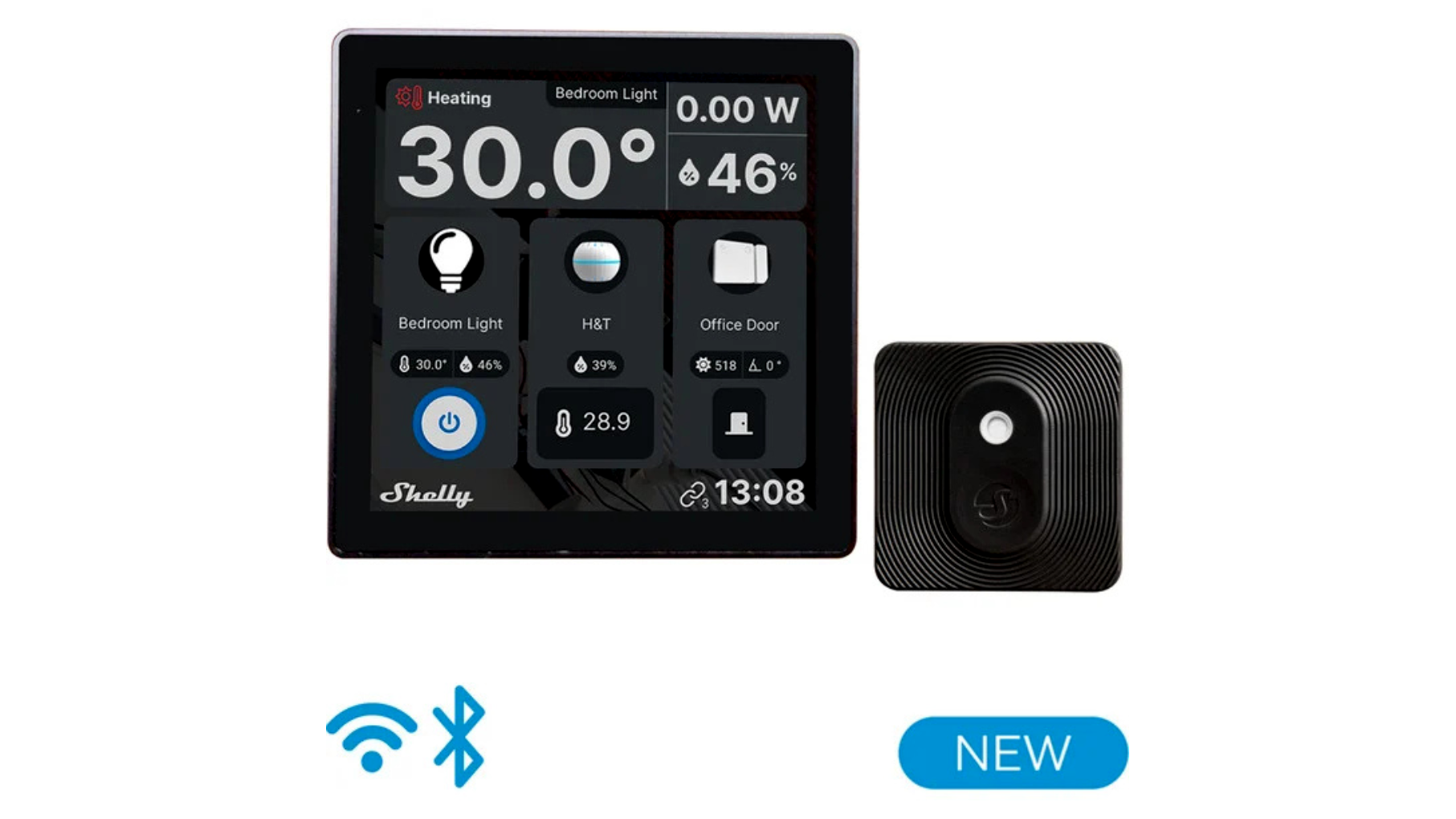 A csomag tartalmazza a Shelly BLU H&T hőmérséklet- és páratartalom-érzékelőt is, amelynek adatai közvetlenül a kijelzőn jelennek meg. Így az eszköz okos termosztátként is használható: segít az ideális szobahőmérséklet és komfort megteremtésében, miközben támogatja az energiahatékony fűtés- és hűtésvezérlést.